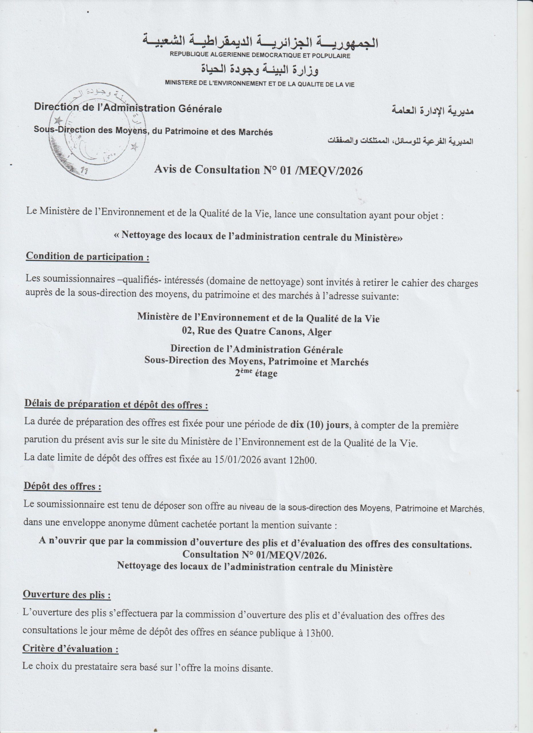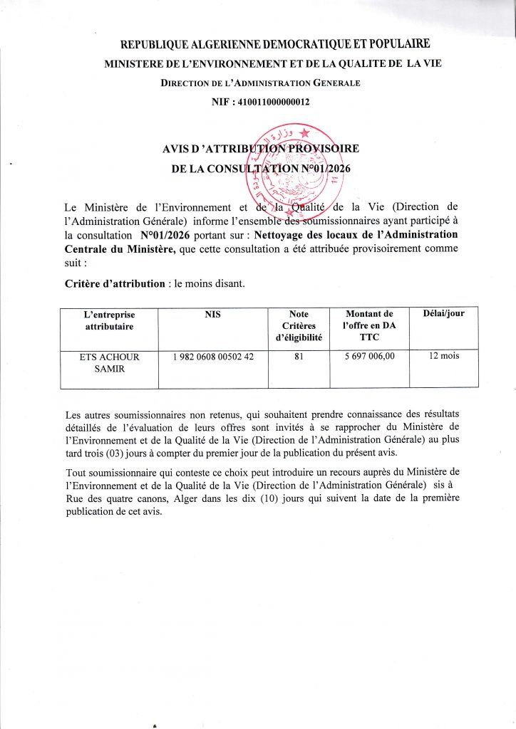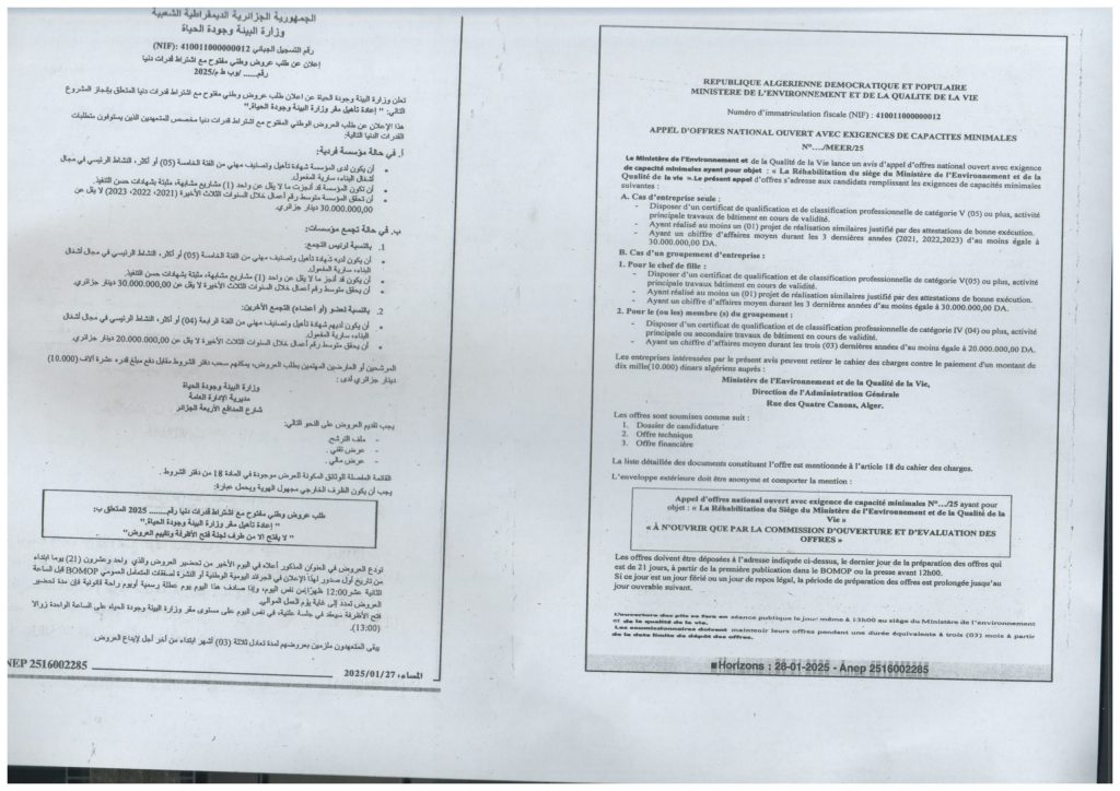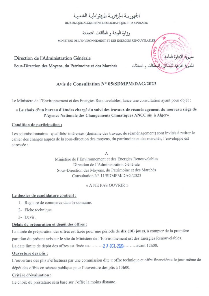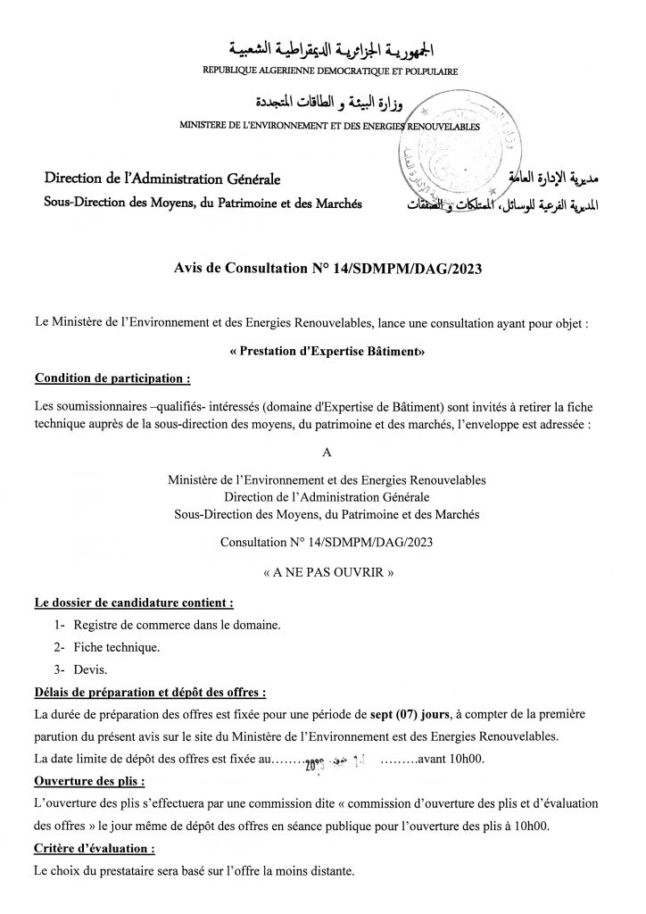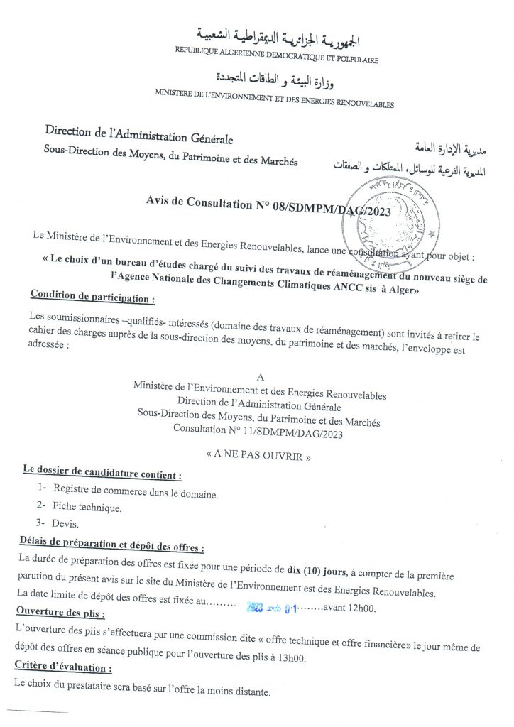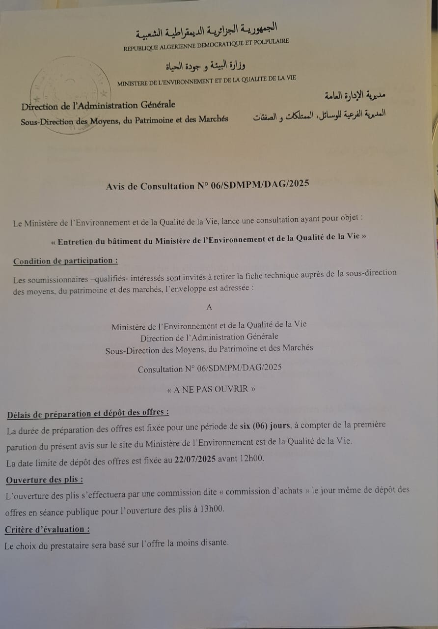 Appel d’offres national ouvert avec exigences de capacités minimales portant sur « La réhabilitation du siège du Ministère de l’Environnement et de la Qualité de la Vie »