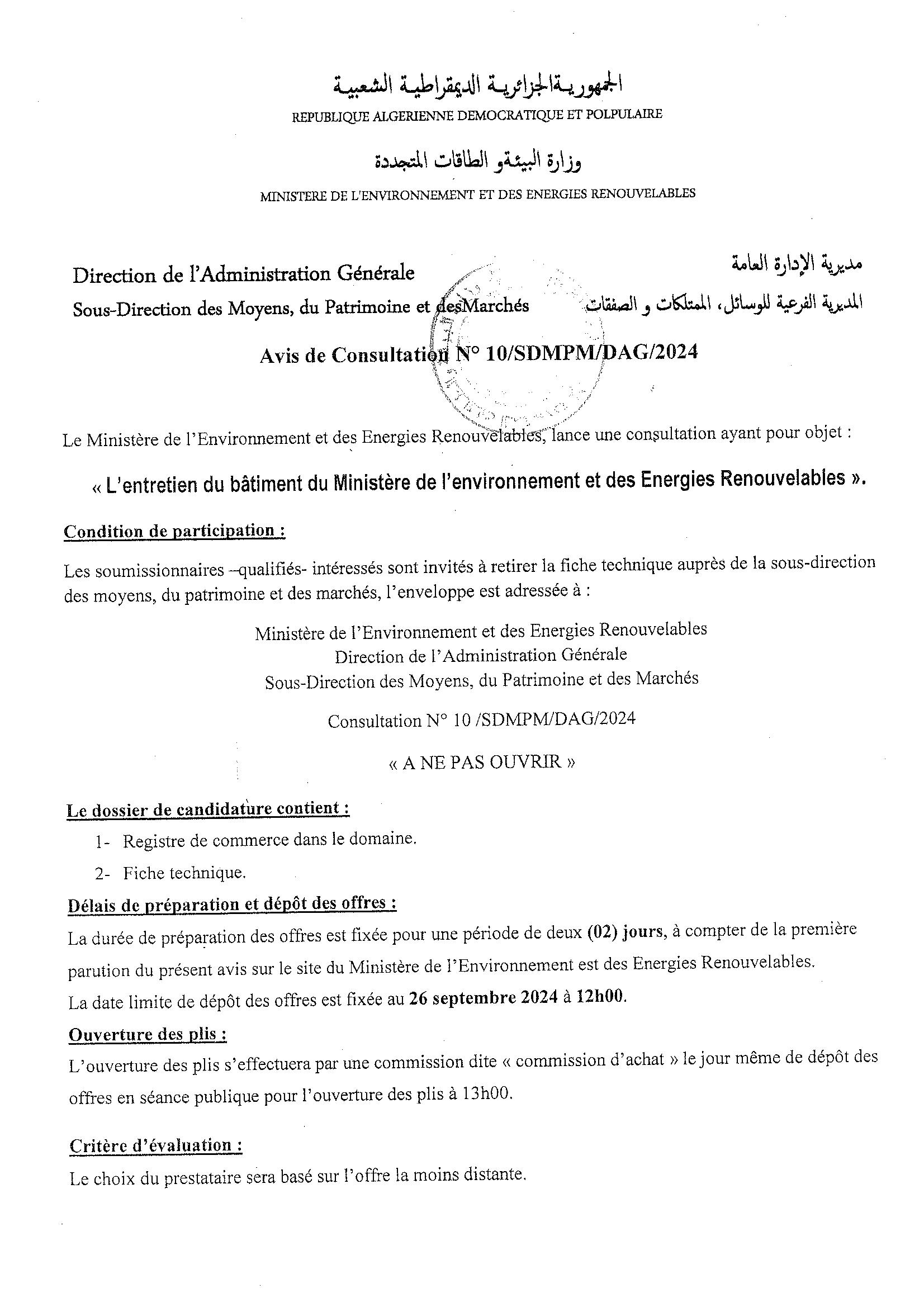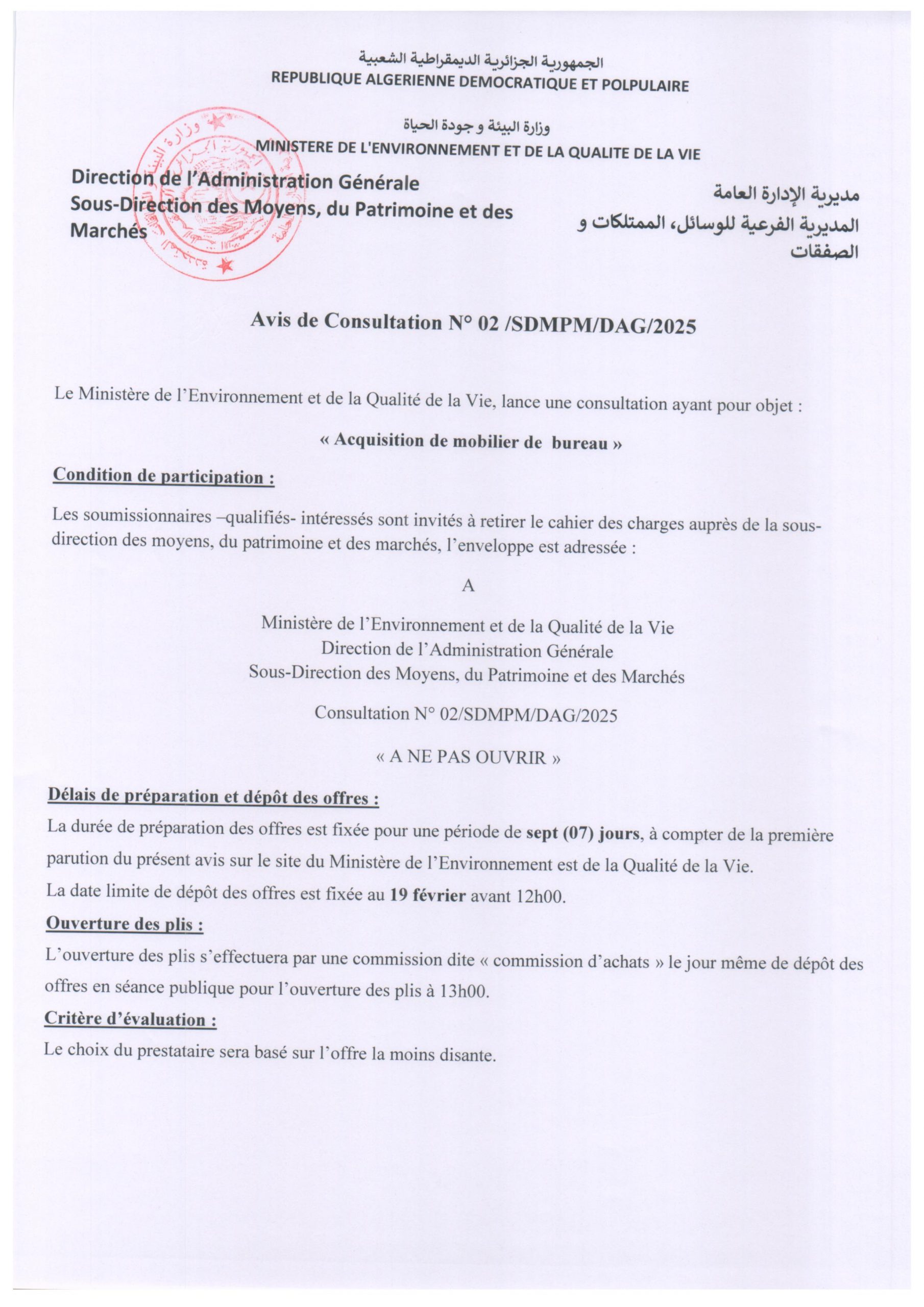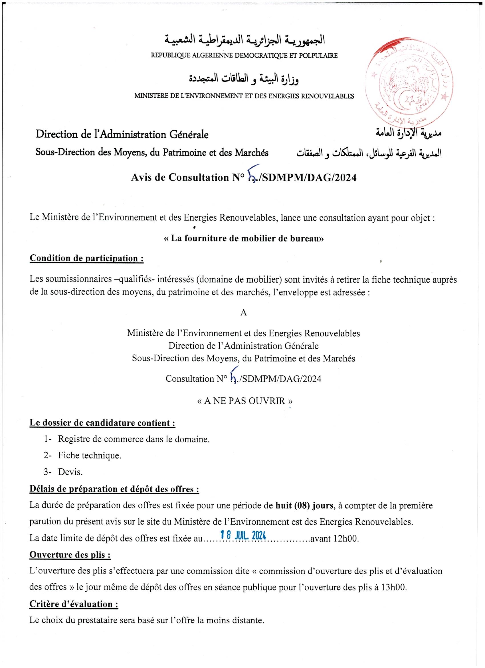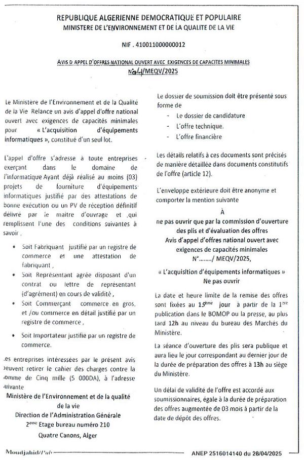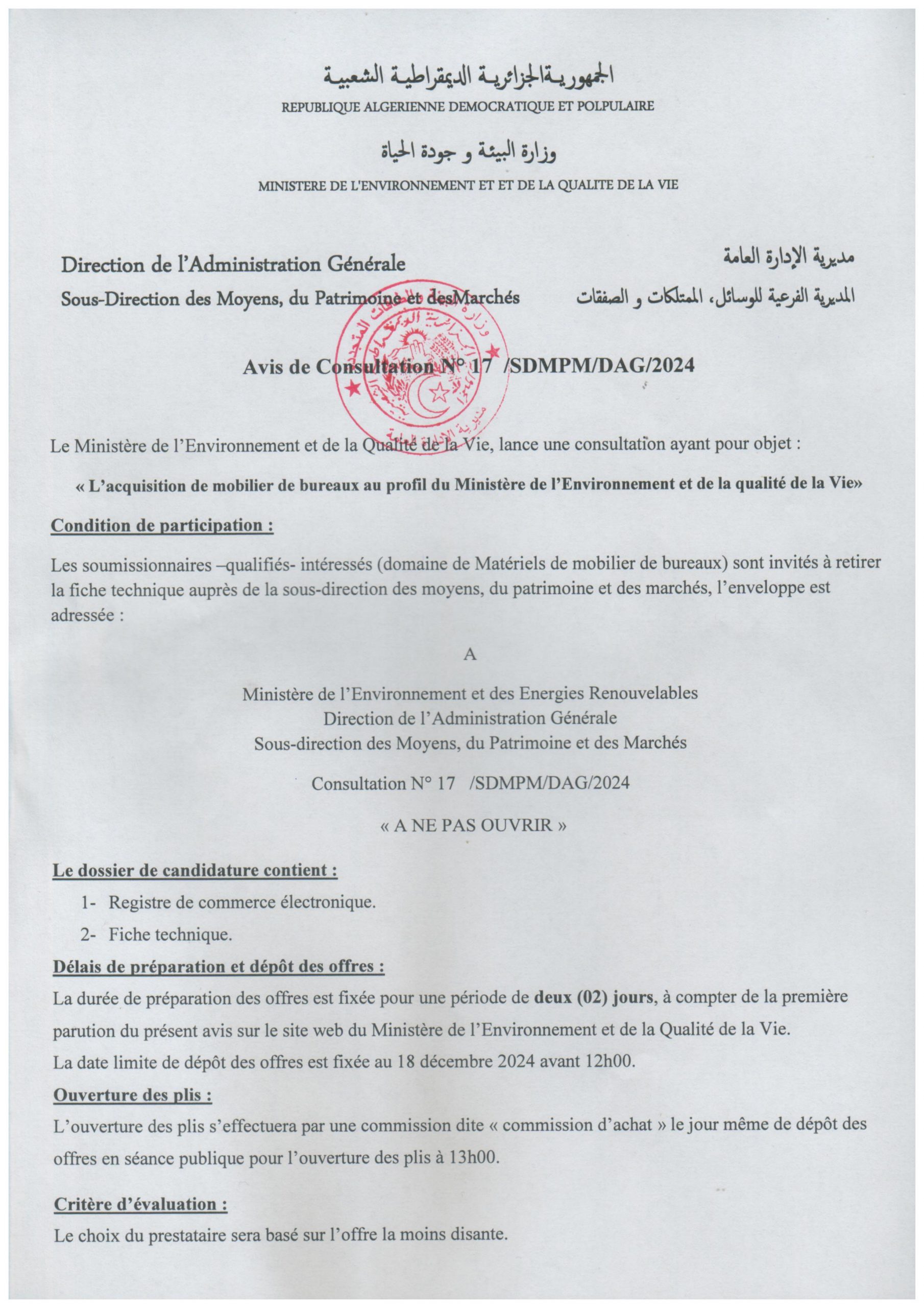 Appel d’offres national ouvert avec exigences de capacités minimales portant sur « La réhabilitation du siège du Ministère de l’Environnement et de la Qualité de la Vie »