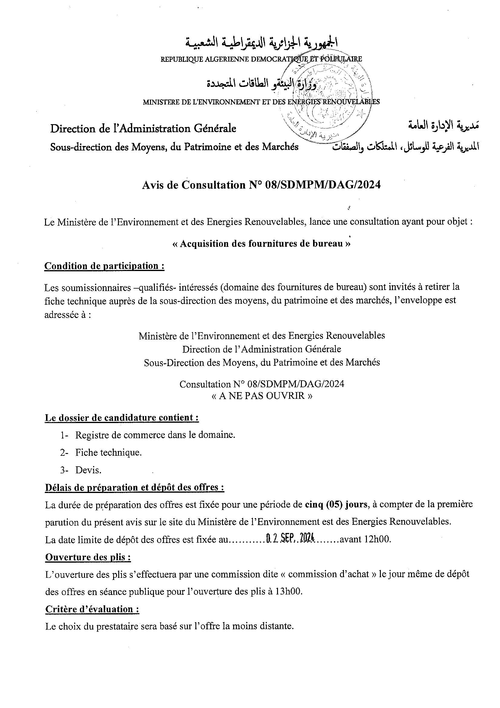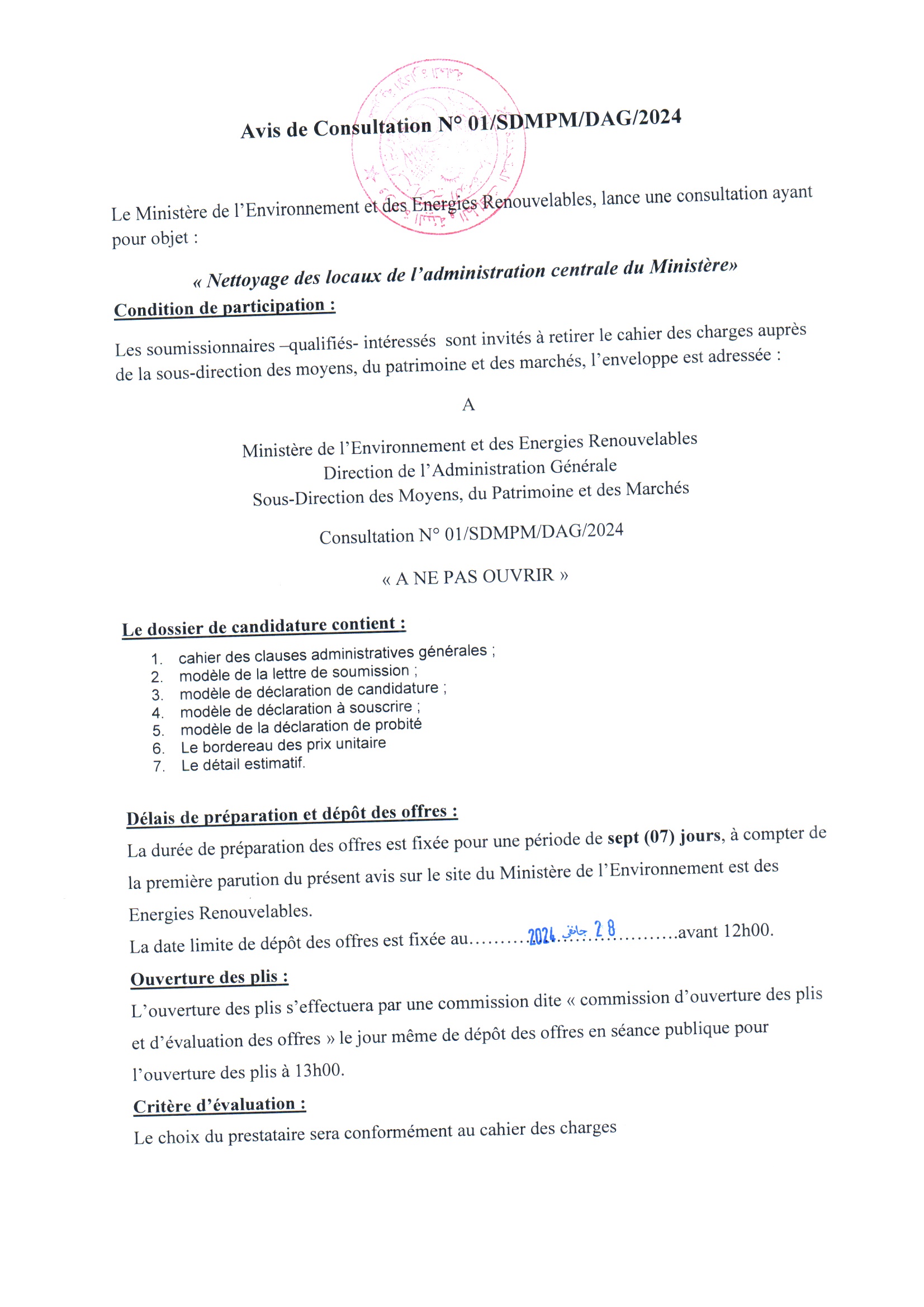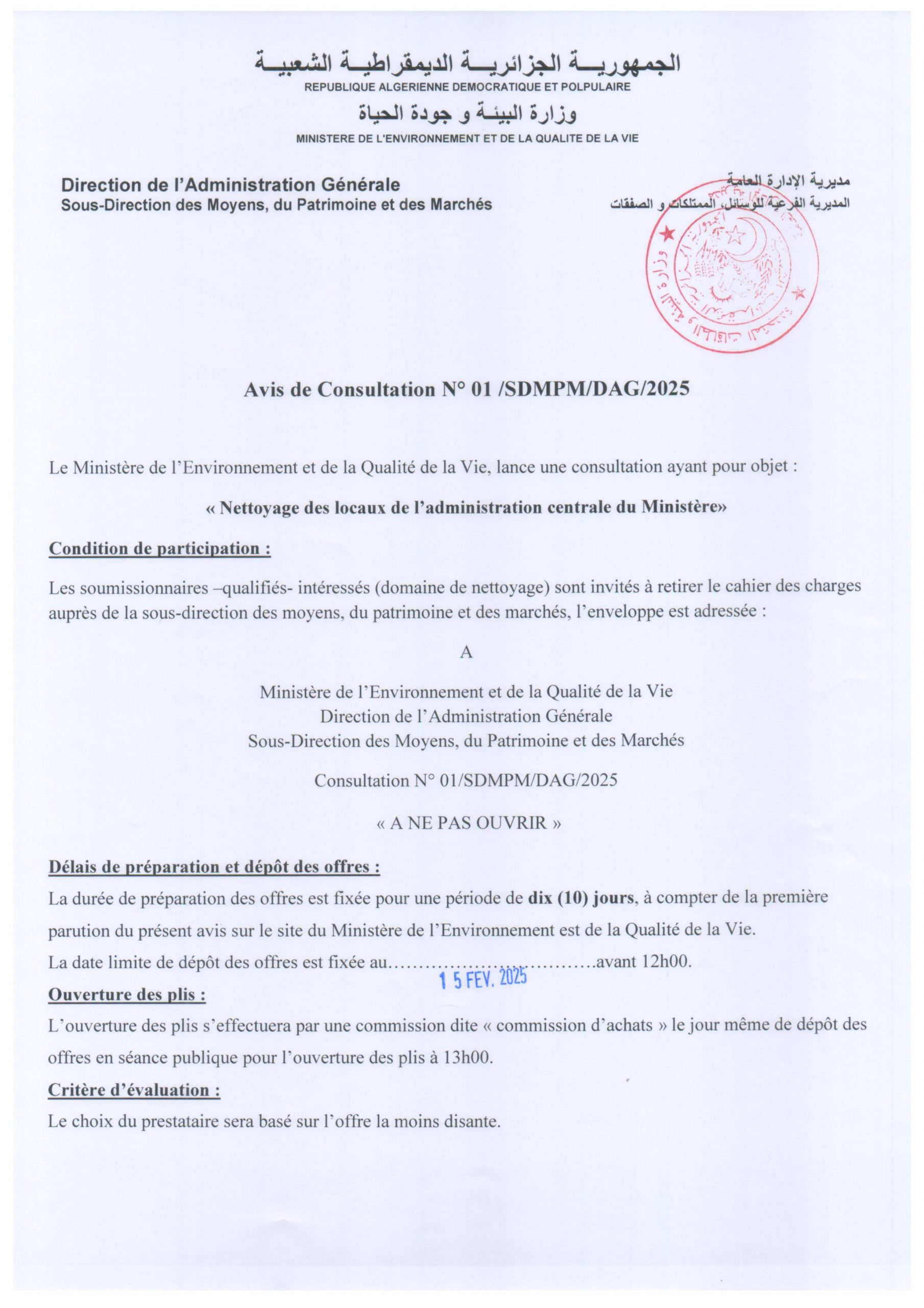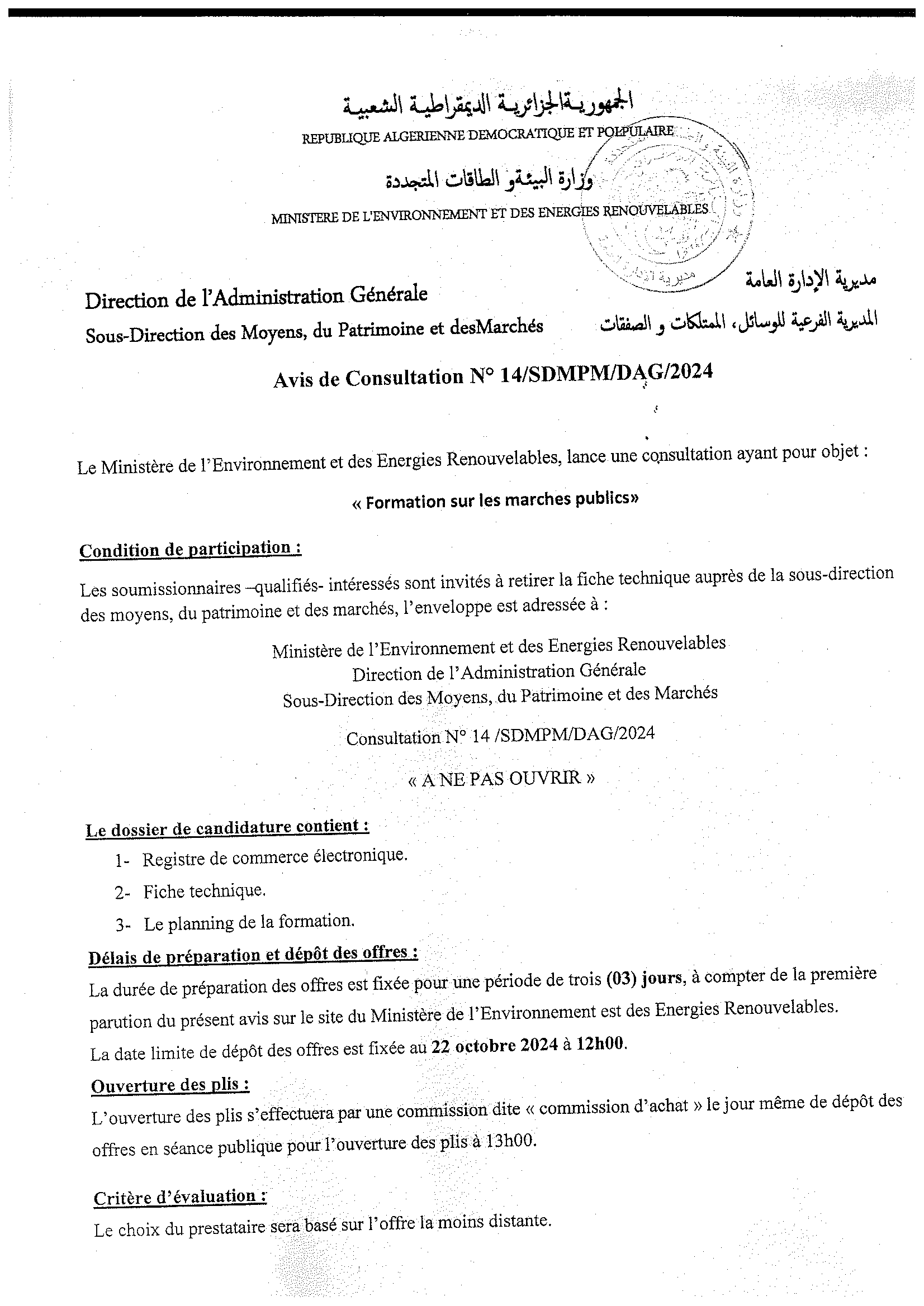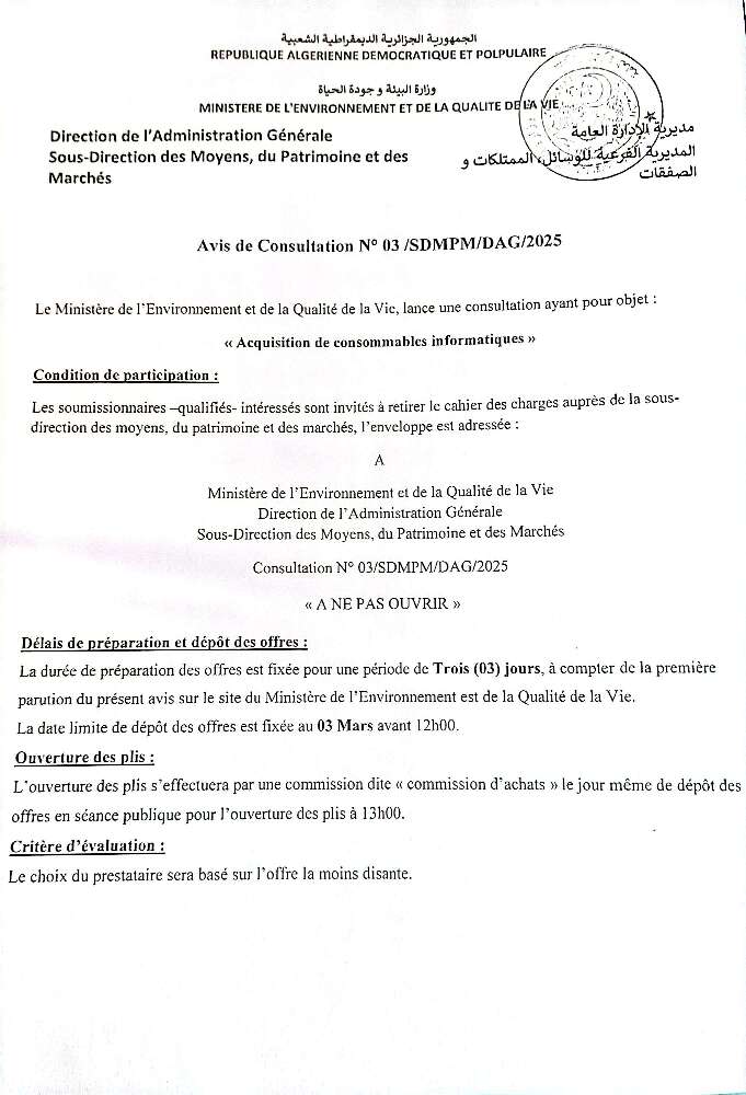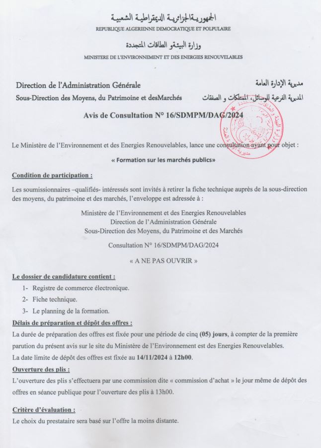 Appel d’offres national ouvert avec exigences de capacités minimales portant sur « La réhabilitation du siège du Ministère de l’Environnement et de la Qualité de la Vie »