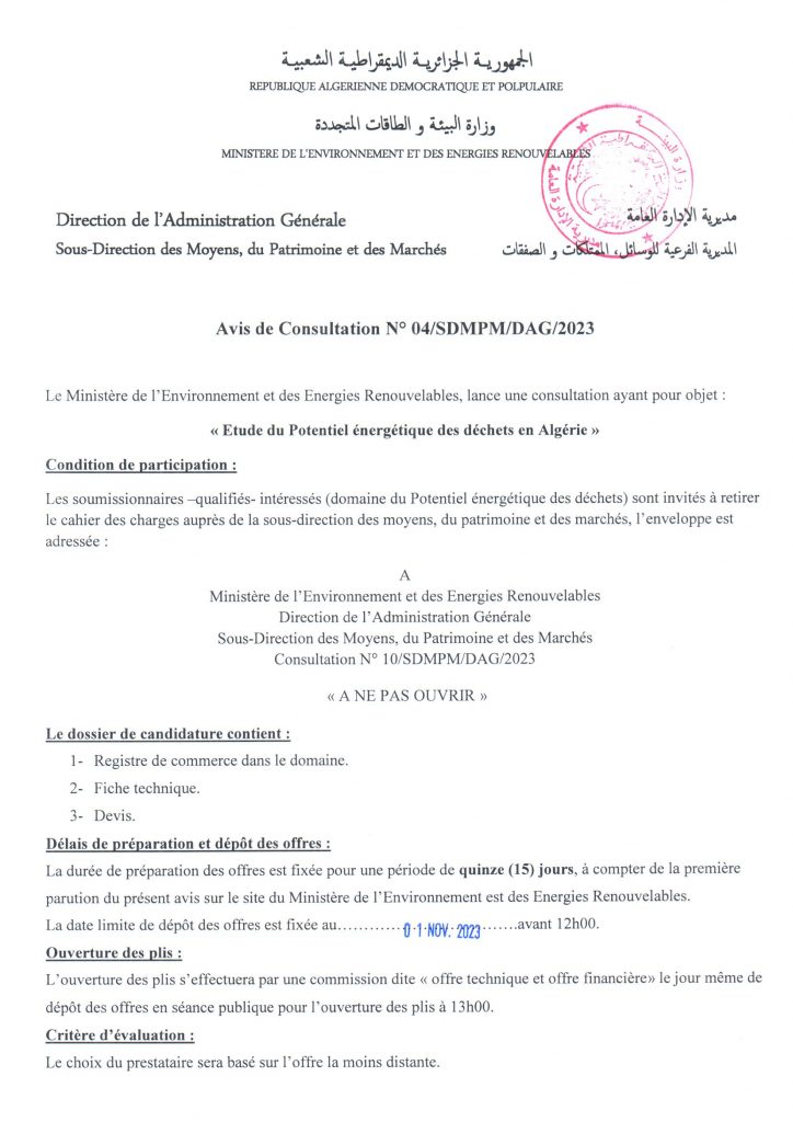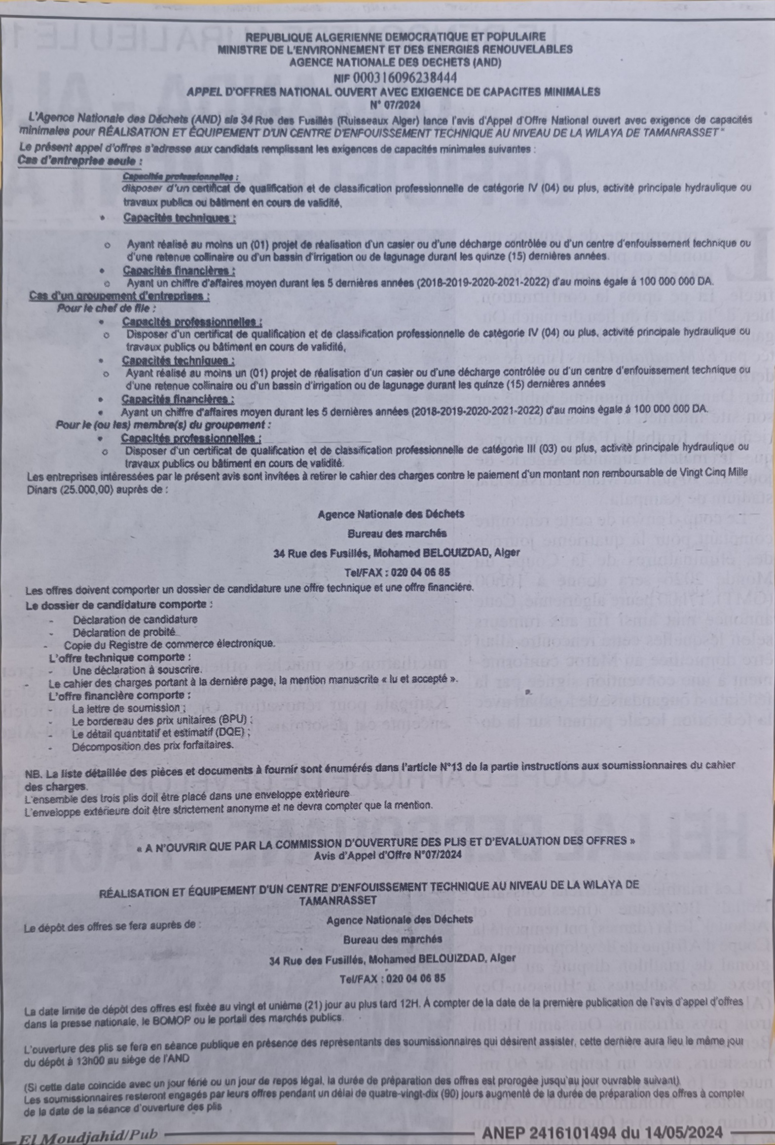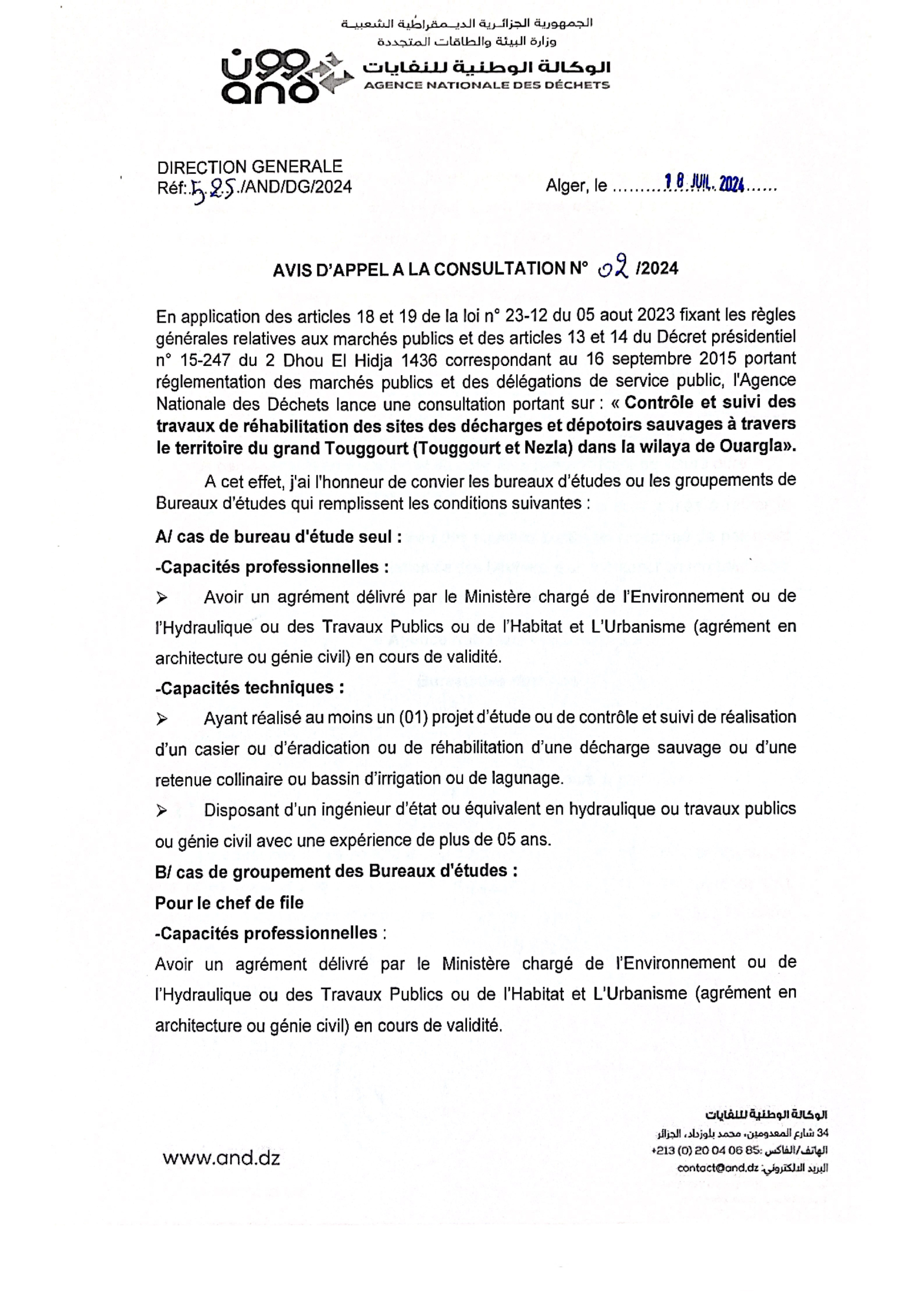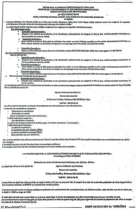AND N°04/2024 « Extension du centre d’enfouissement technique des déchets d’Adrar »
