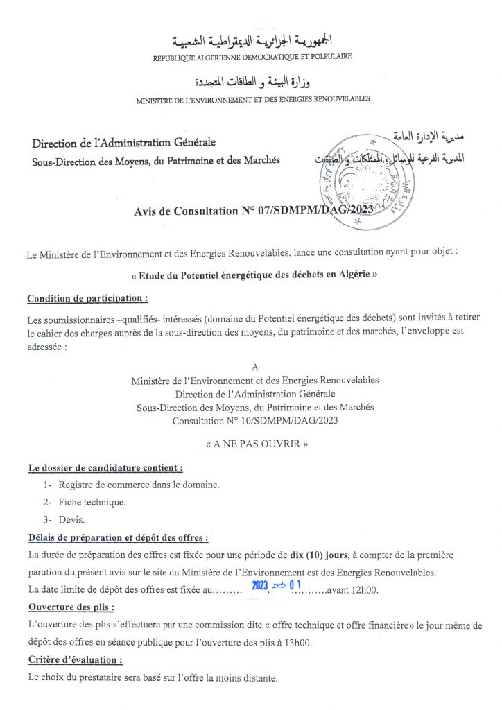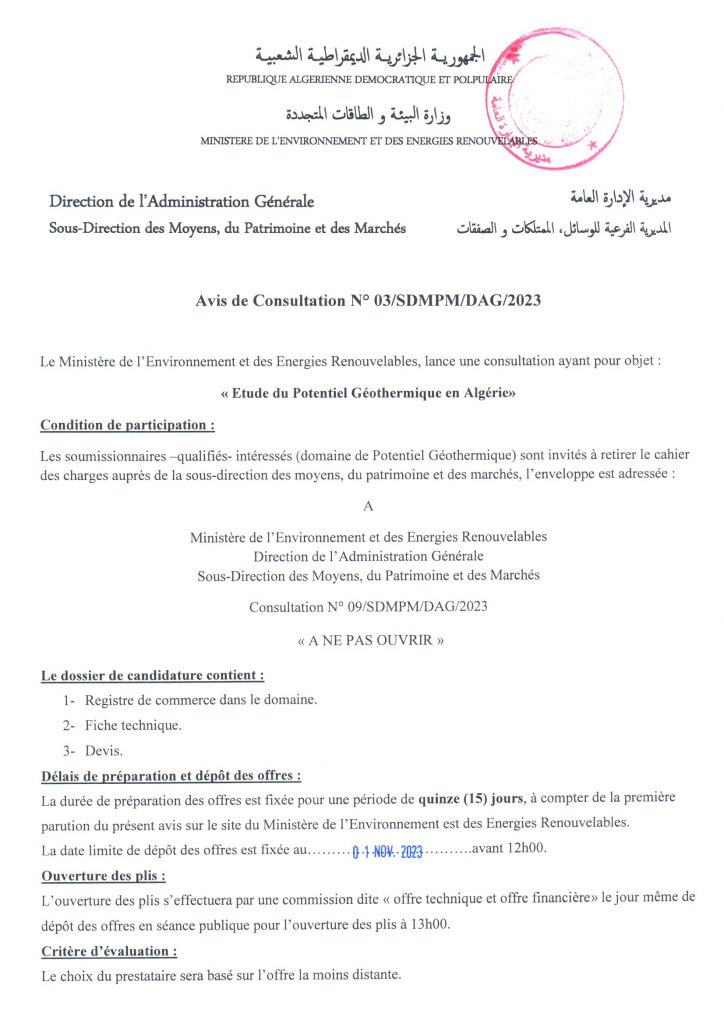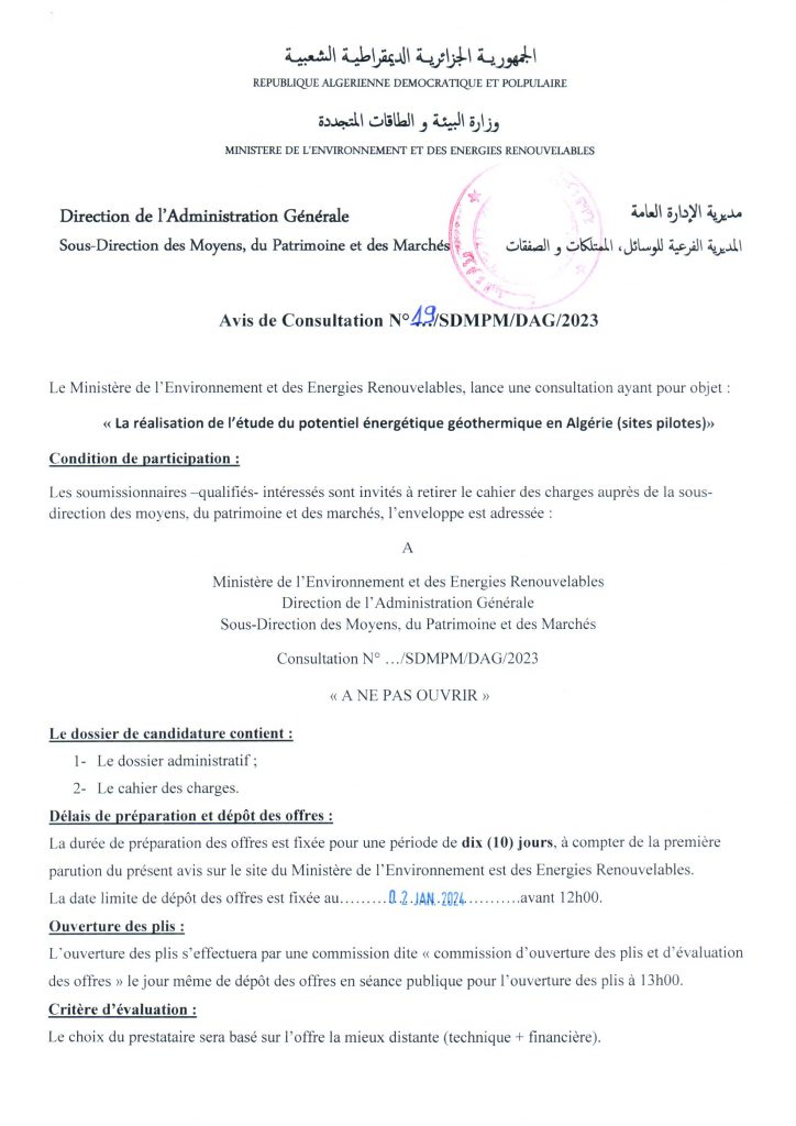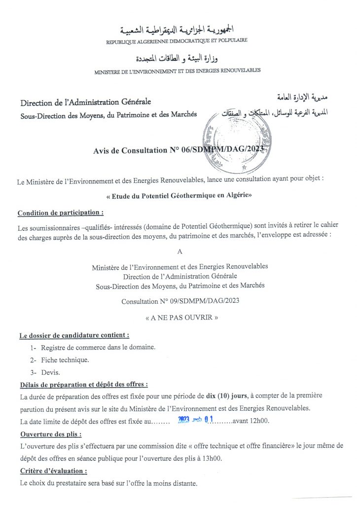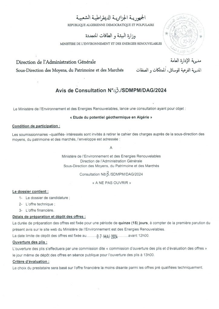 Avis de consultation portant sur « Etude du potentiel géothermique en Algérie (sites pilotes) »