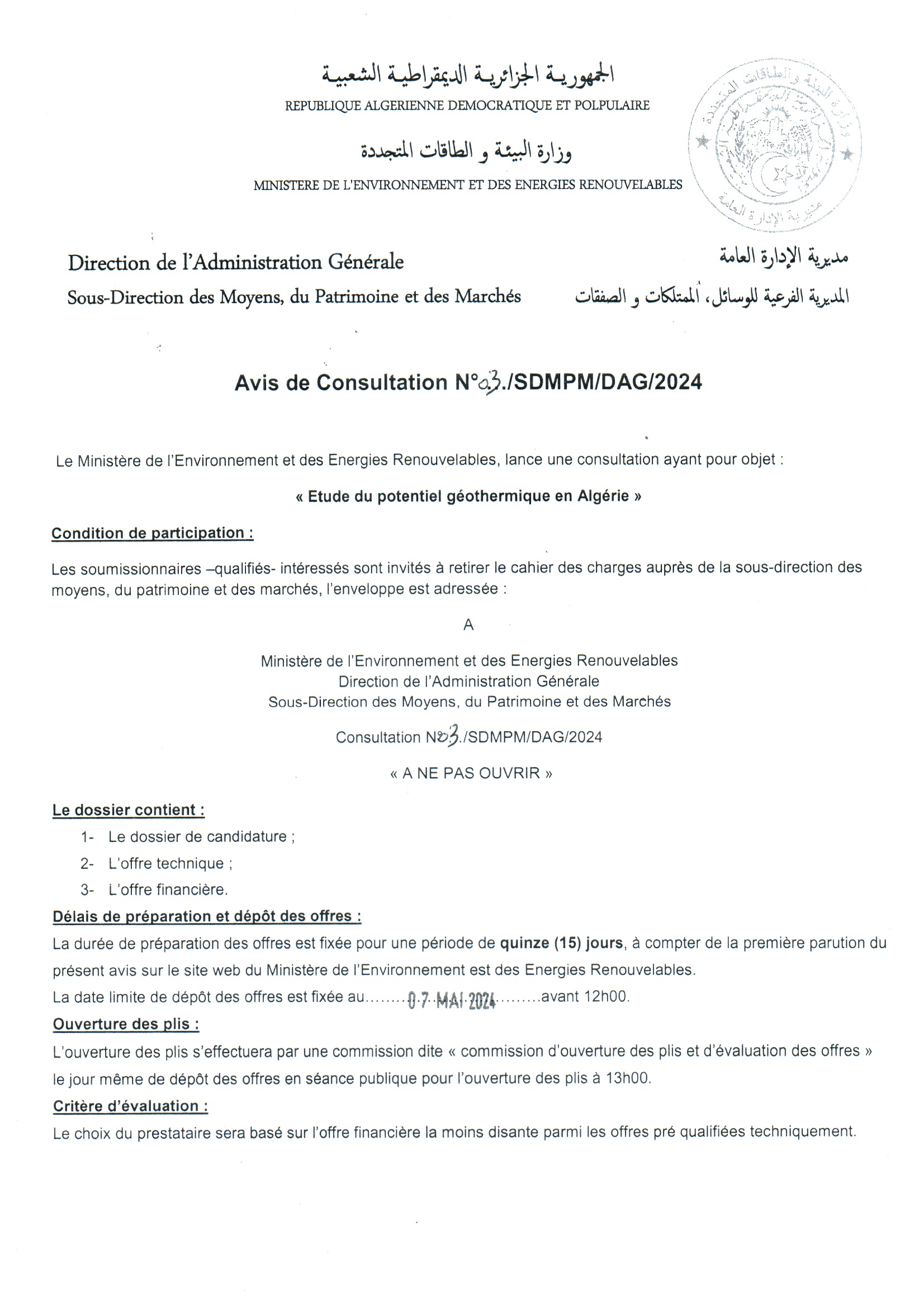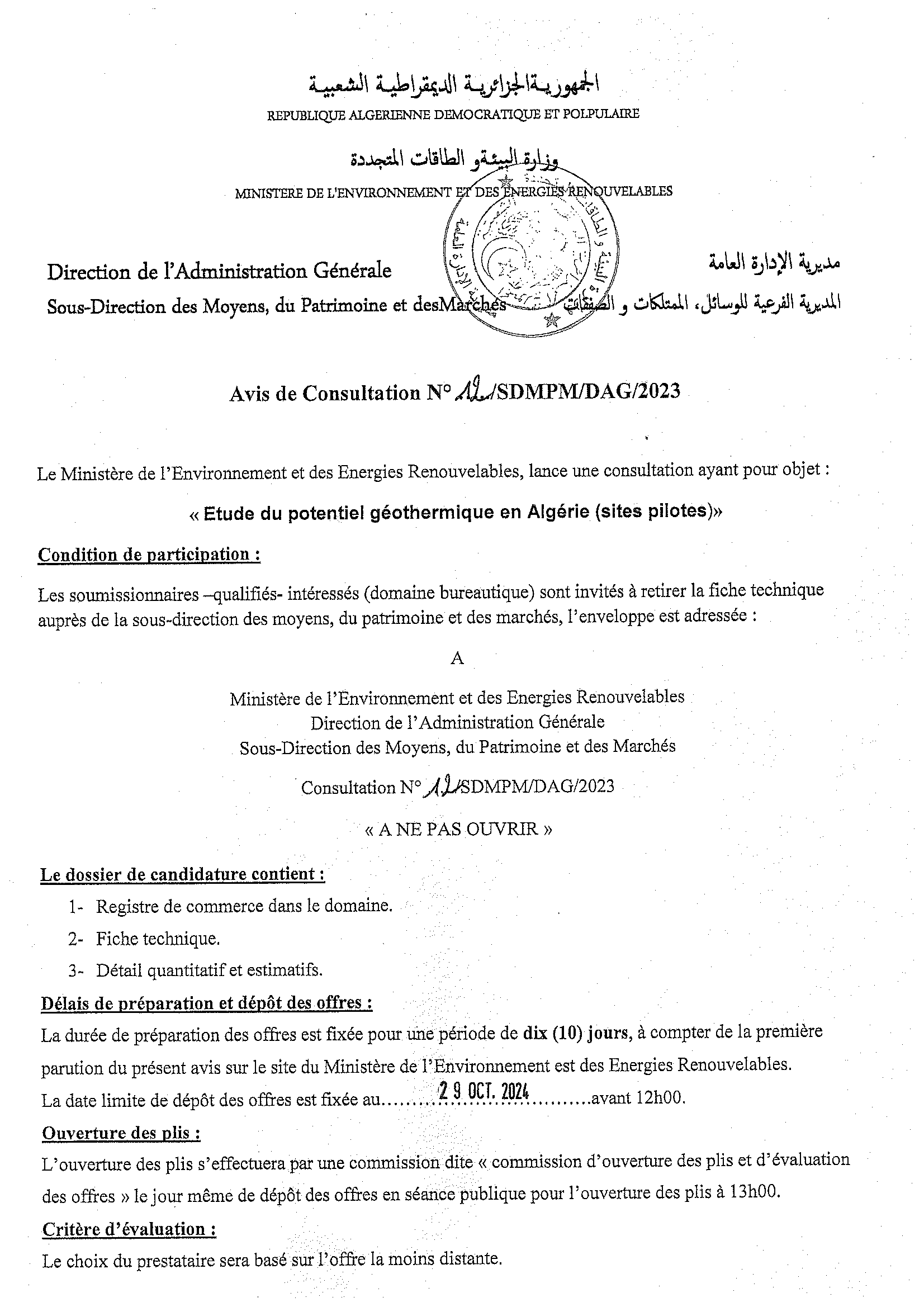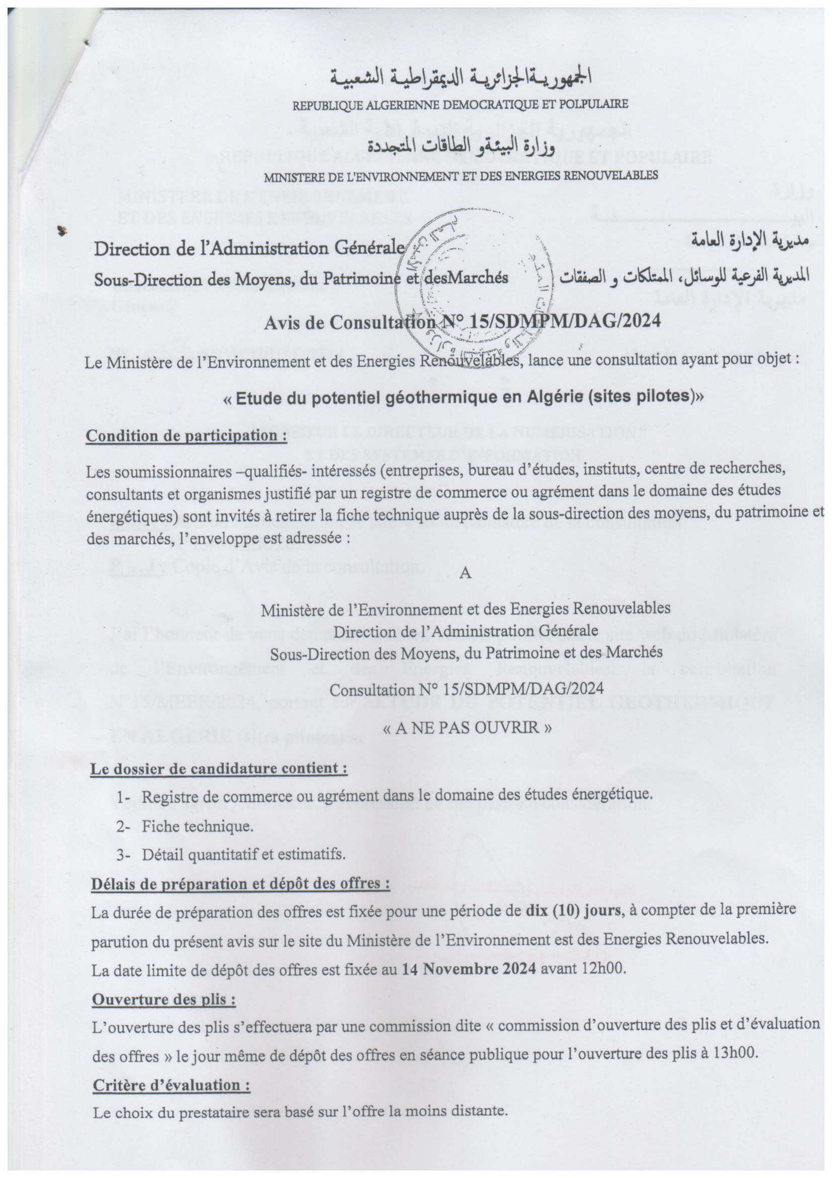 Avis de consultation portant sur « Etude du potentiel géothermique en Algérie (sites pilotes) »