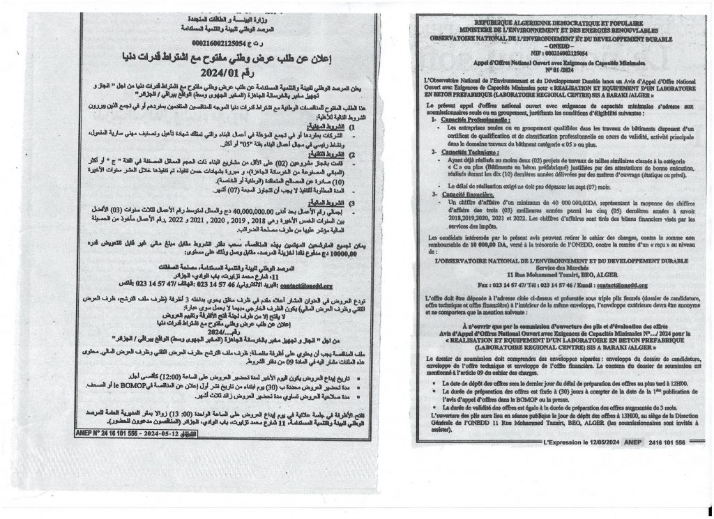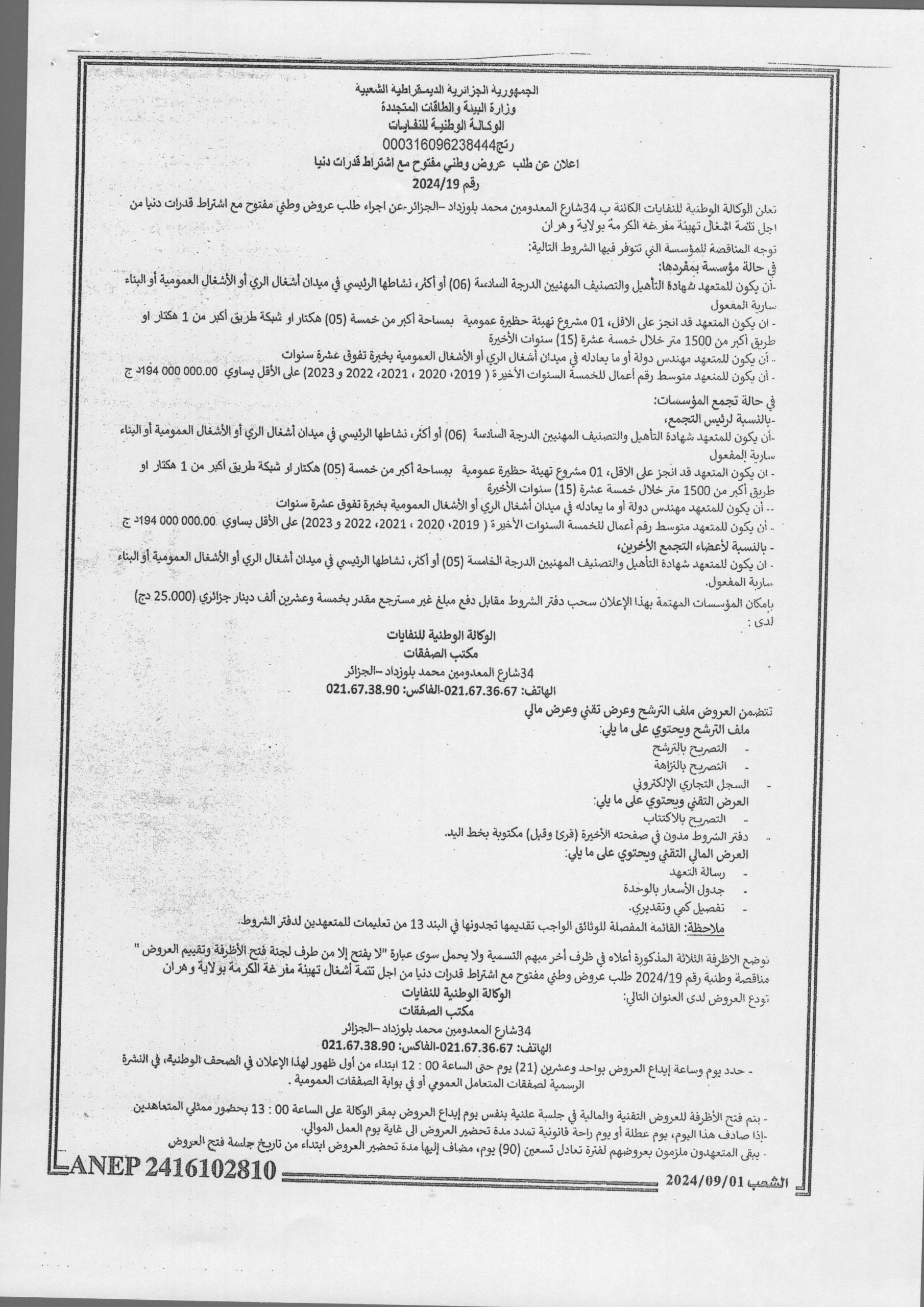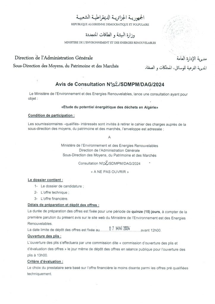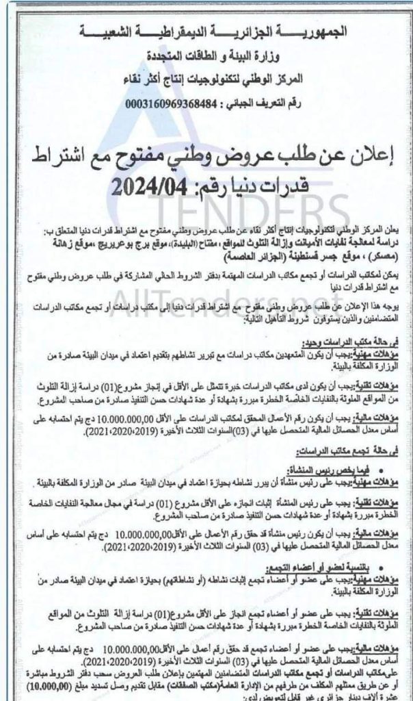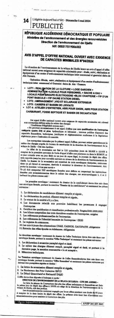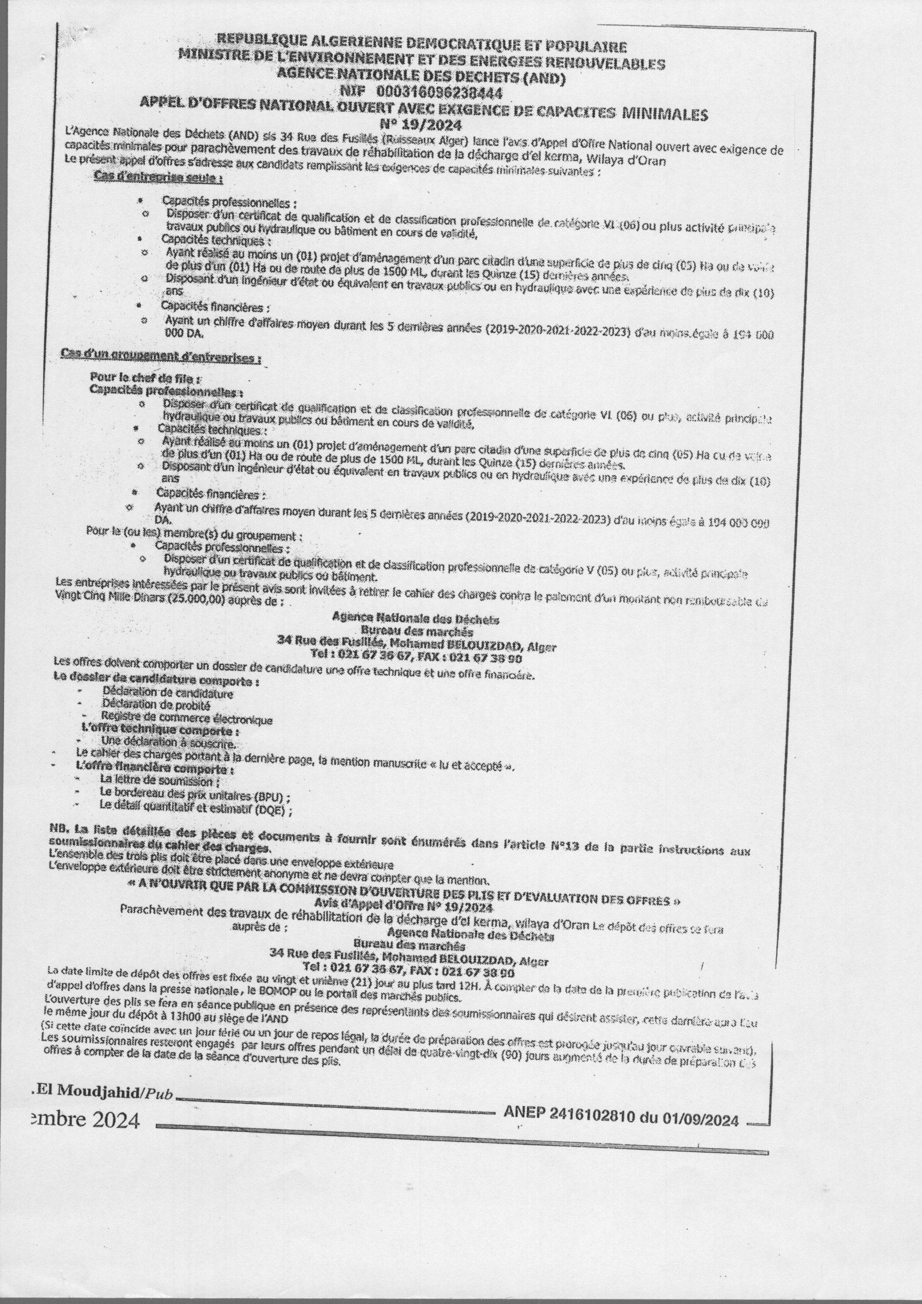 Appel d’offres national ouvert N°19/2024 pour » parachèvement des travaux de réhabilitation de la décharge d’el kerma, wilaya d’Oran »