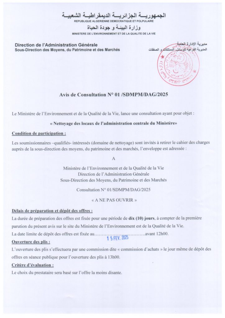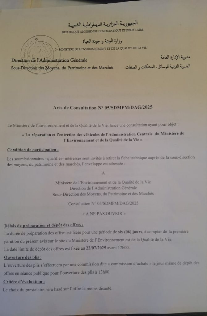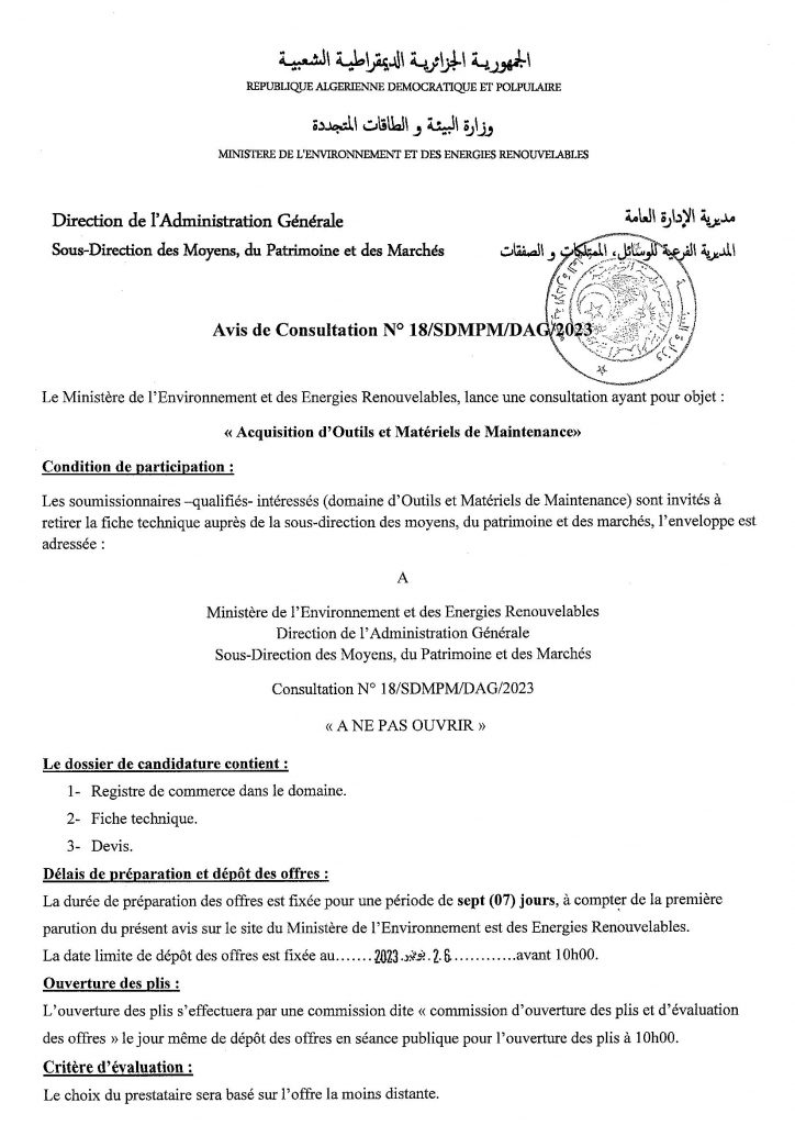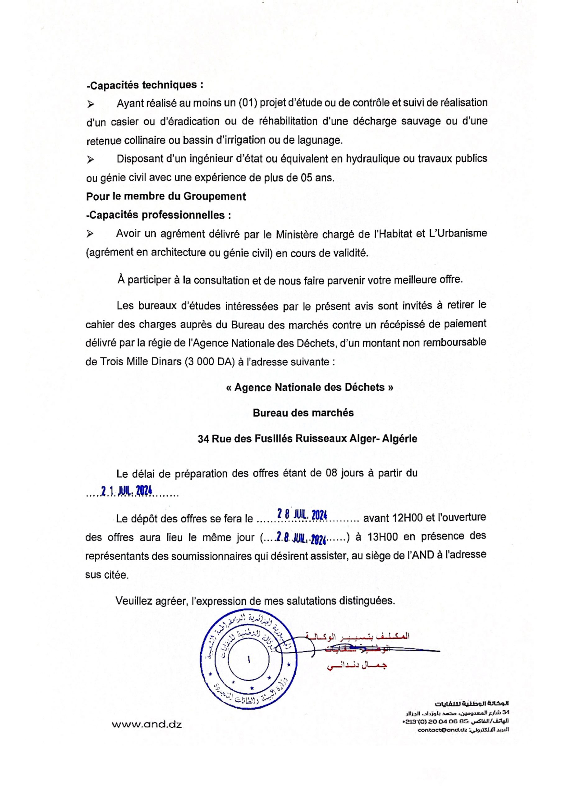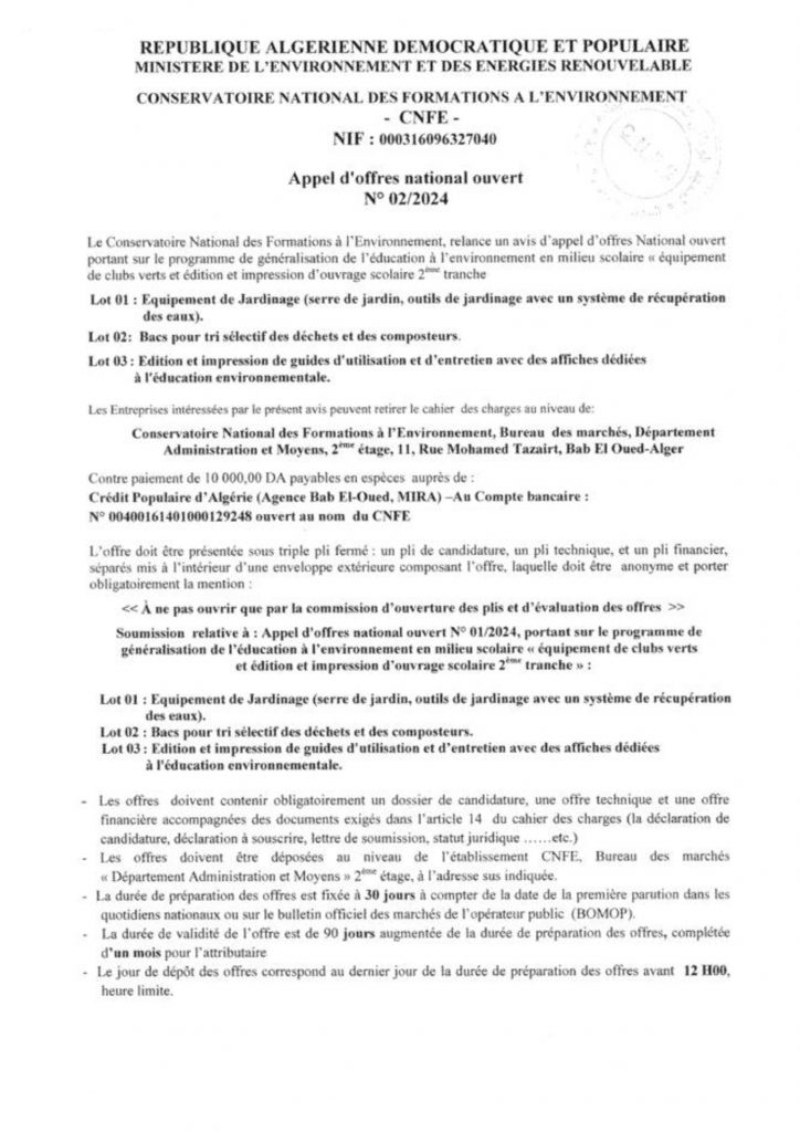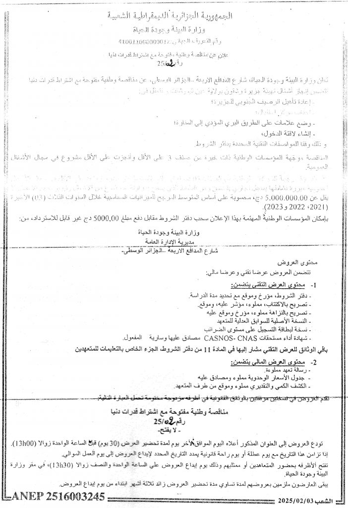Appel d’offres national ouvert N°19/2024 pour » parachèvement des travaux de réhabilitation de la décharge d’el kerma, wilaya d’Oran »