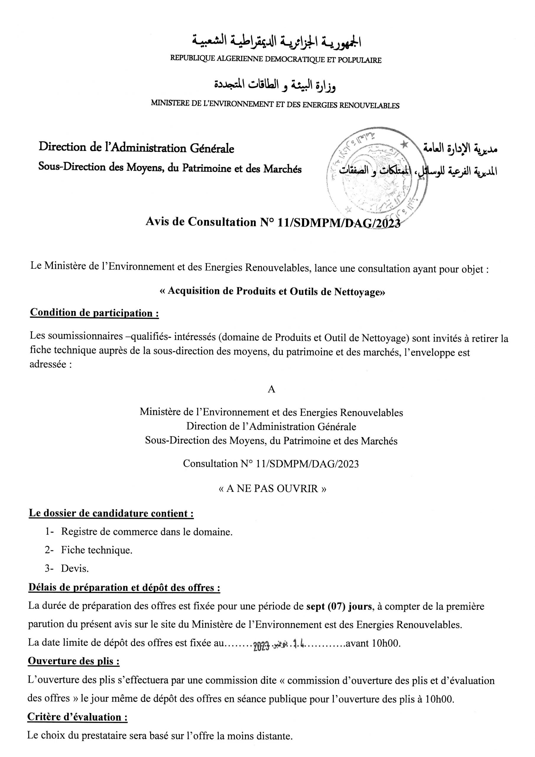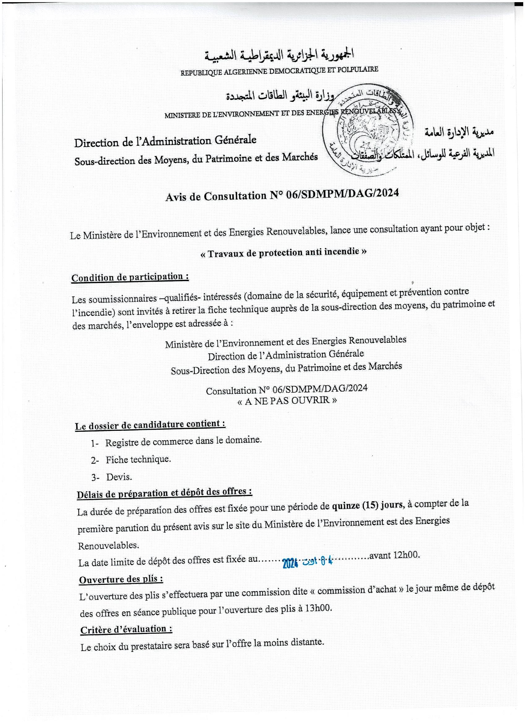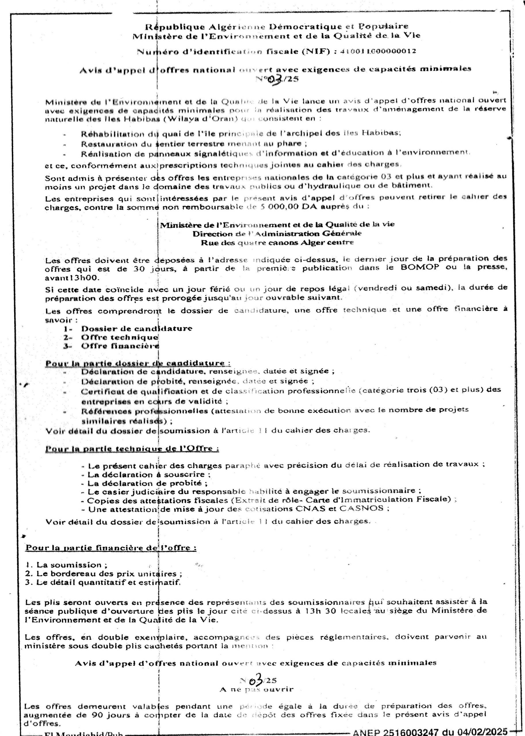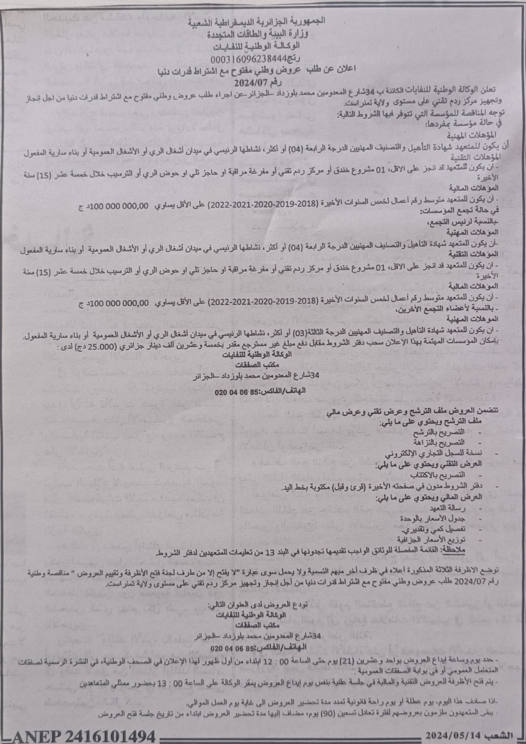 Appel d’offres national ouvert N°19/2024 pour » parachèvement des travaux de réhabilitation de la décharge d’el kerma, wilaya d’Oran »