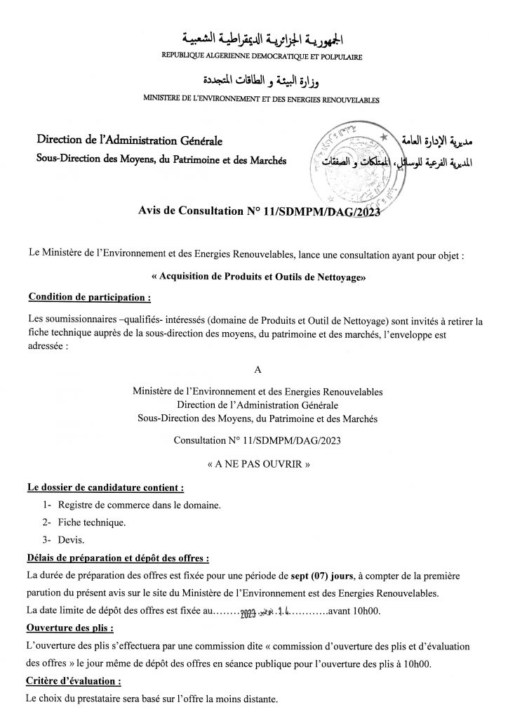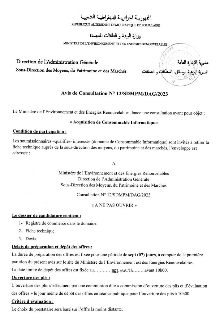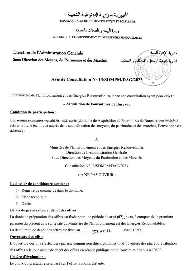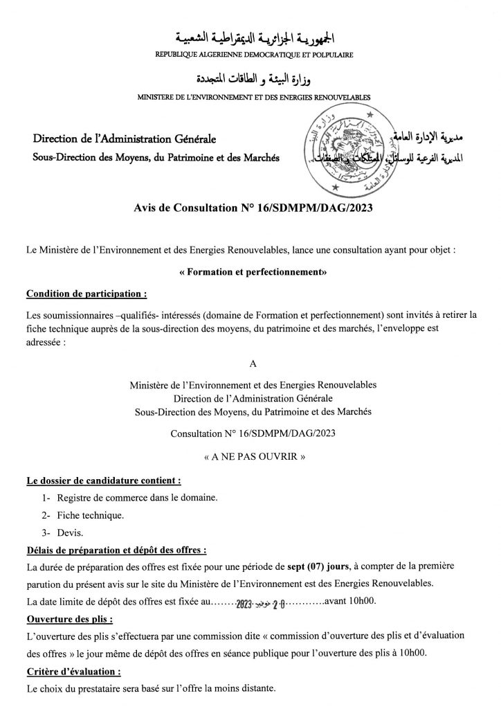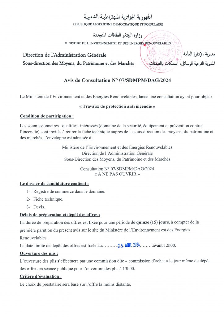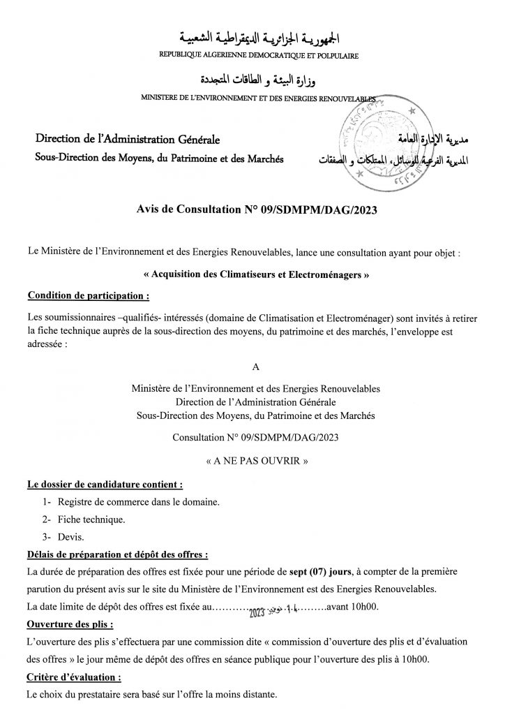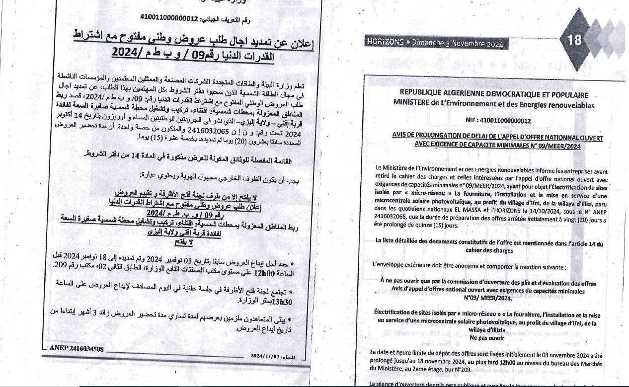 Avis de prolongation de l’appel d’offres national ouvert avec exigences de capacités minimales pour » l’Electrification de sites isolés par {micro-réseau} la fourniture, l’installation et la mise en service d’une microcentrale solaire photovoltaïque, au profit du village d’Ifni, de la wilaya d’Illizi«