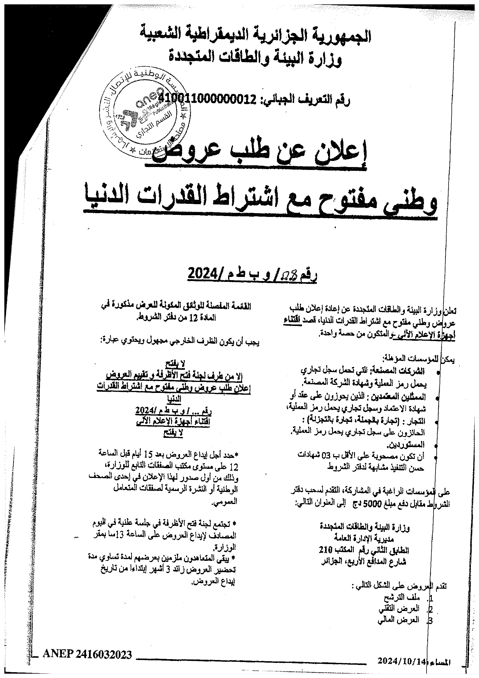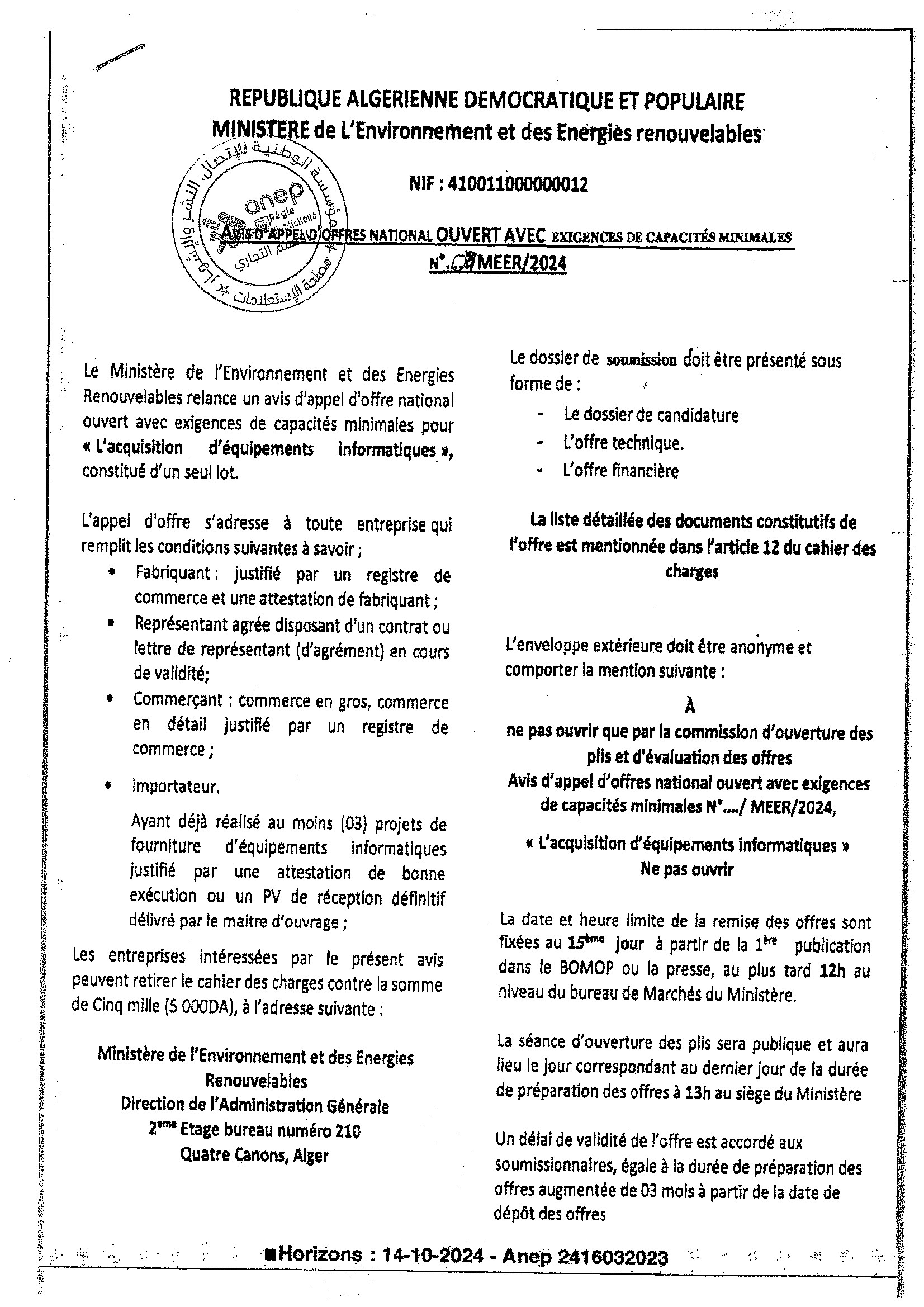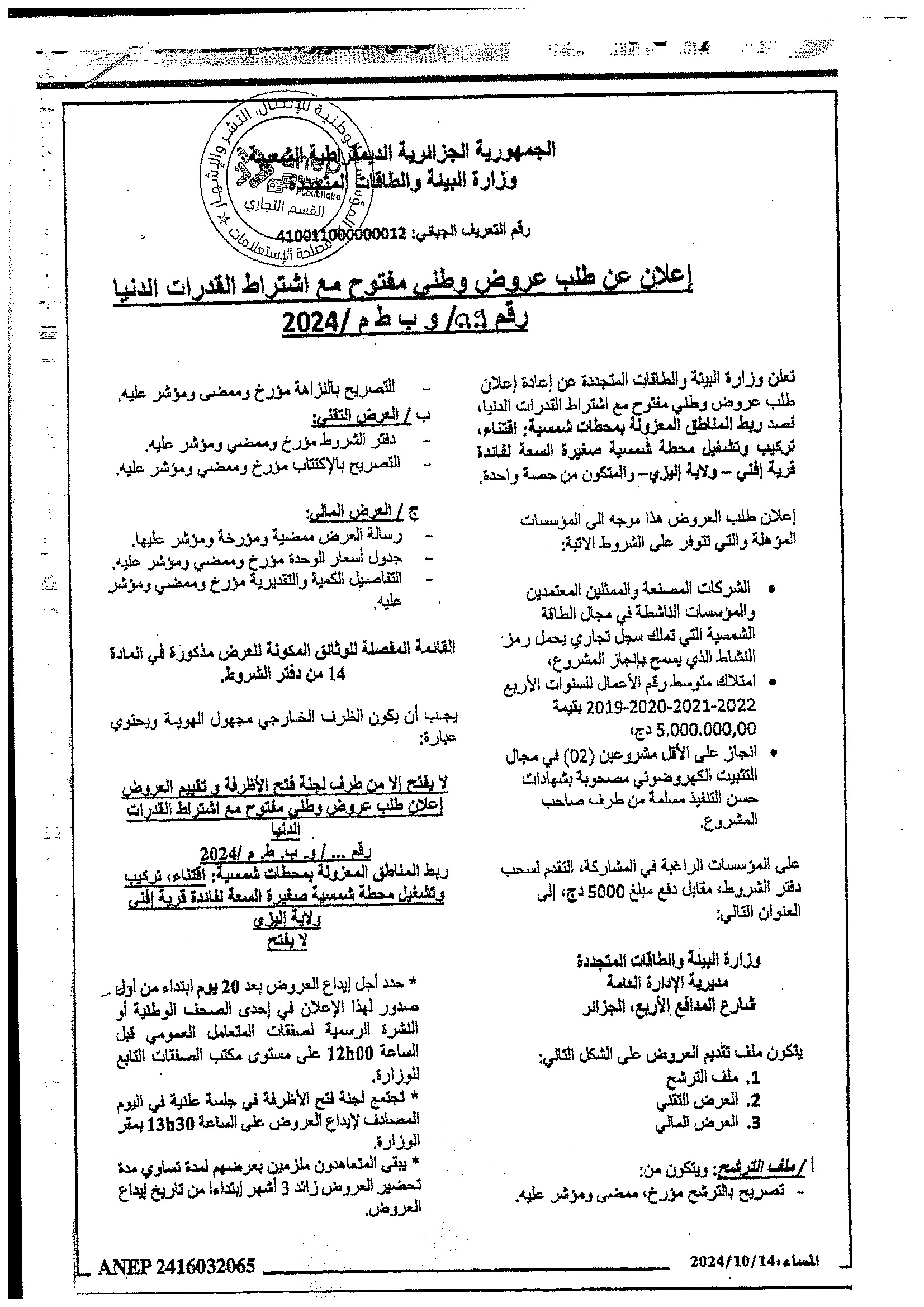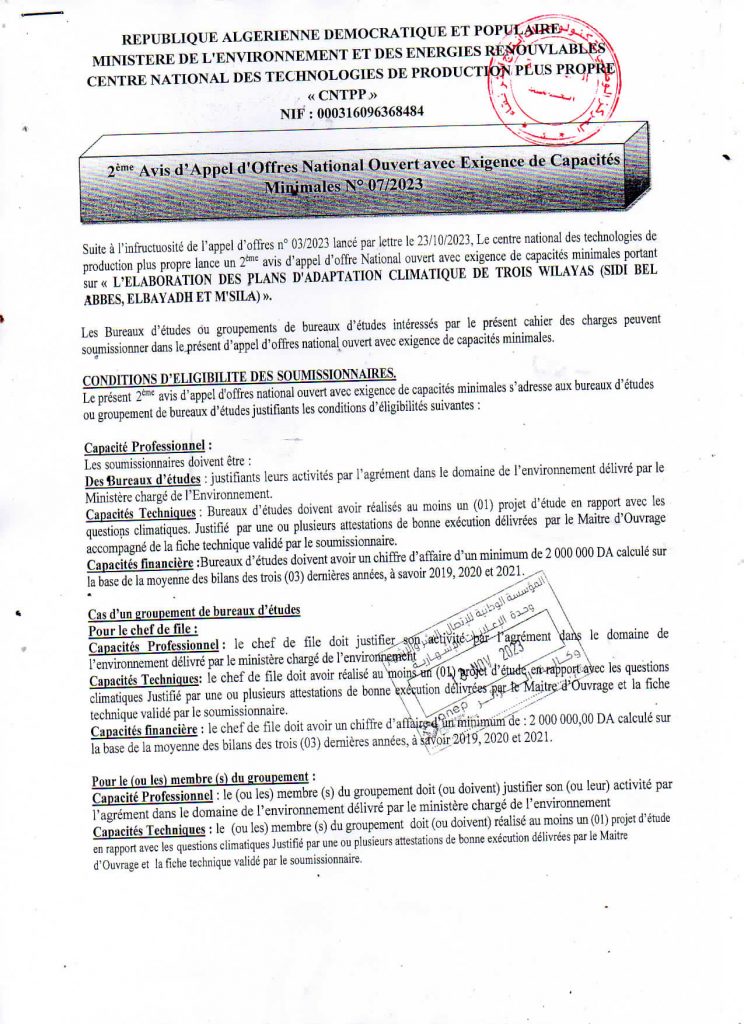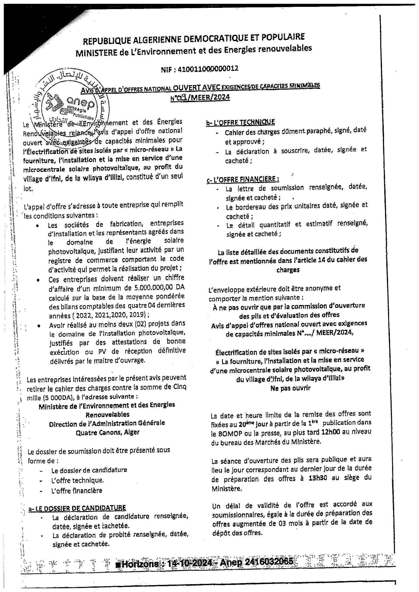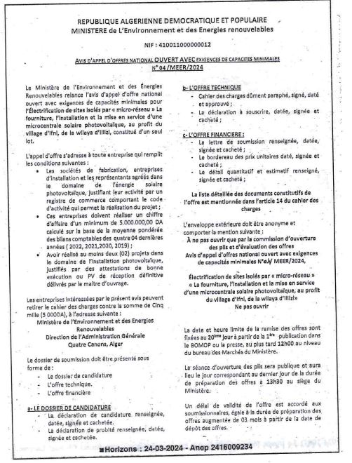 Avis d’appel d’offres national ouvert avec exigences de capacités minimales pour » l’Electrification de sites isolés par {micro-réseau} la fourniture, l’installation et la mise en service d’une microcentrale solaire photovoltaïque, au profit du village d’Ifni, de la wilaya d’Illizi«