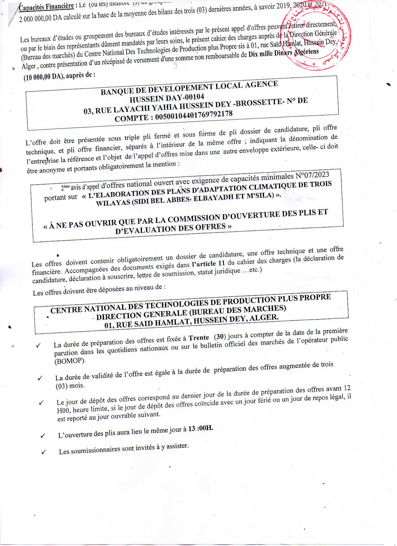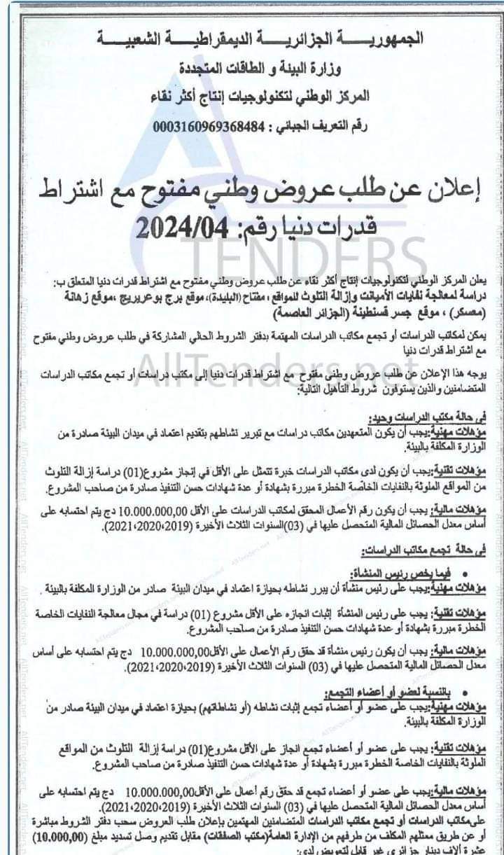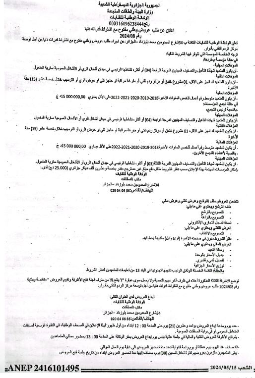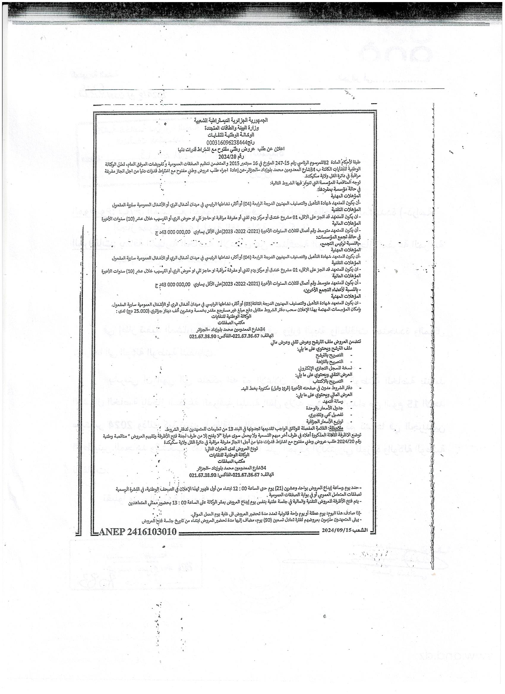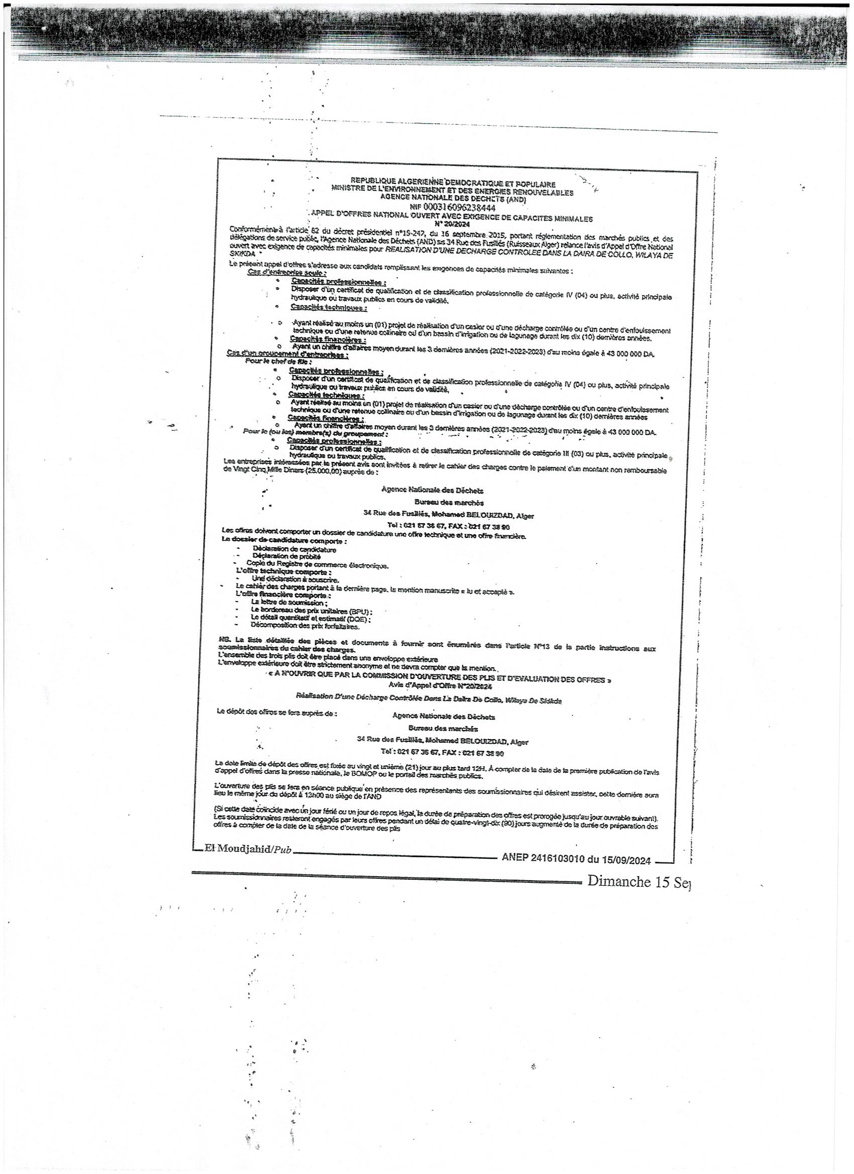 Avis d’appel d’offres national ouvert avec exigences de capacités minimales N°20/2024 pour » Réalisation d’une décharge controlée dans la Daira de Collo, Wilaya de Skikda »