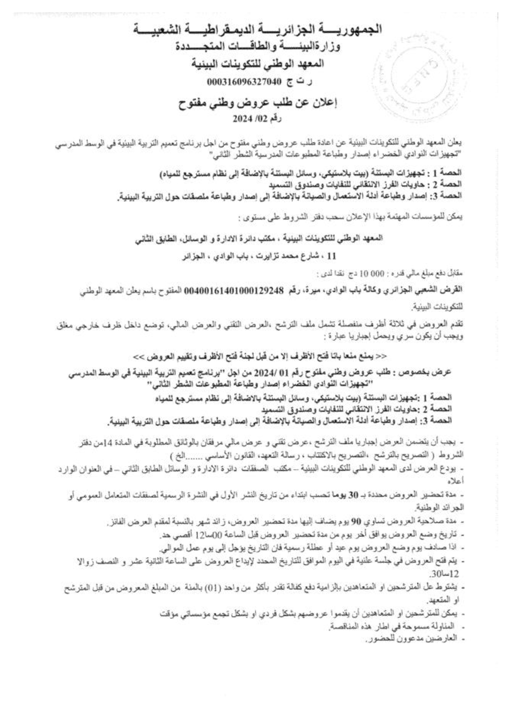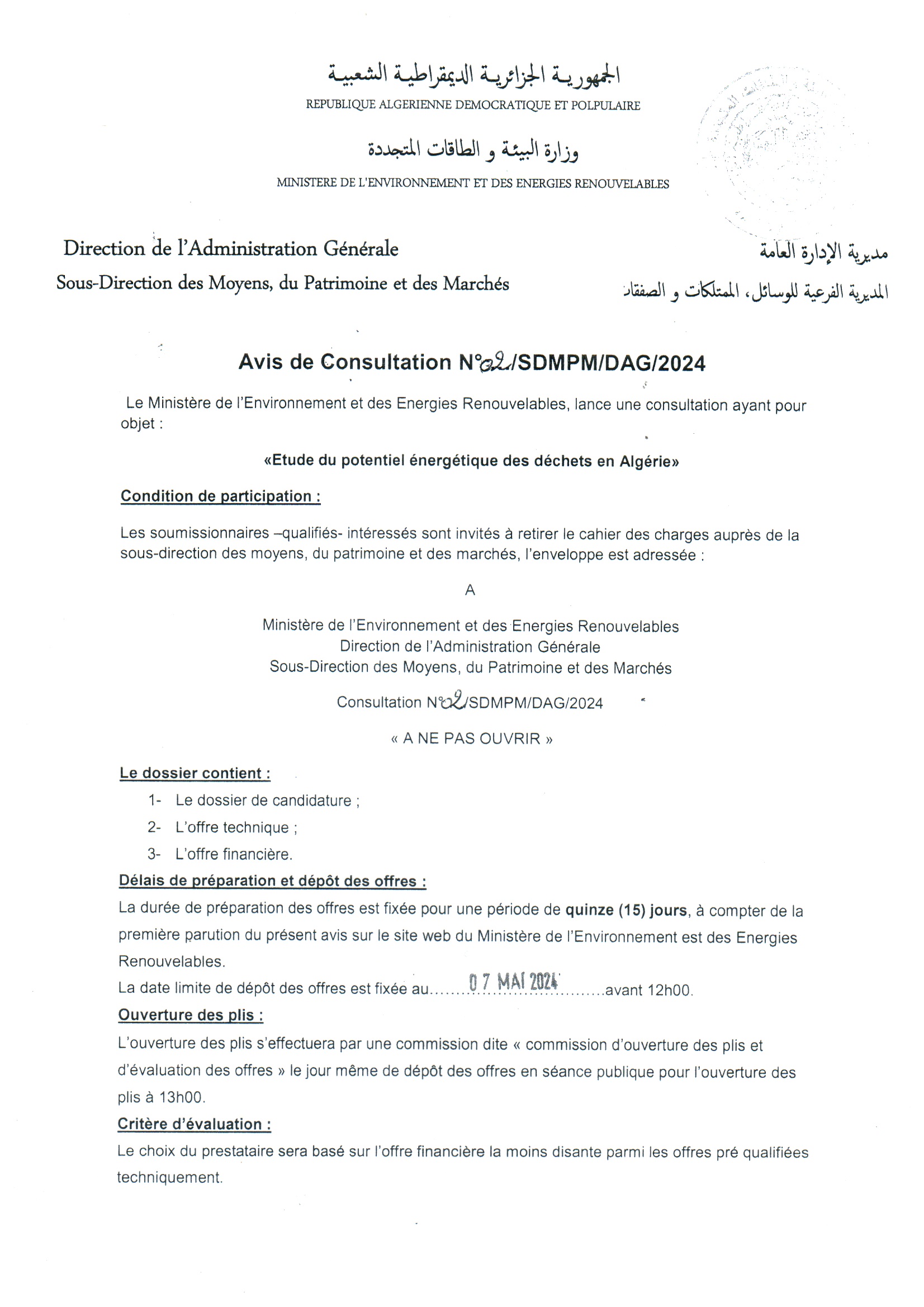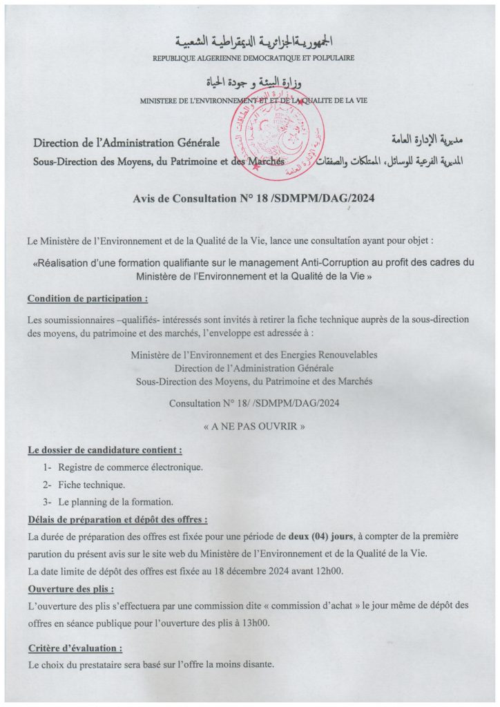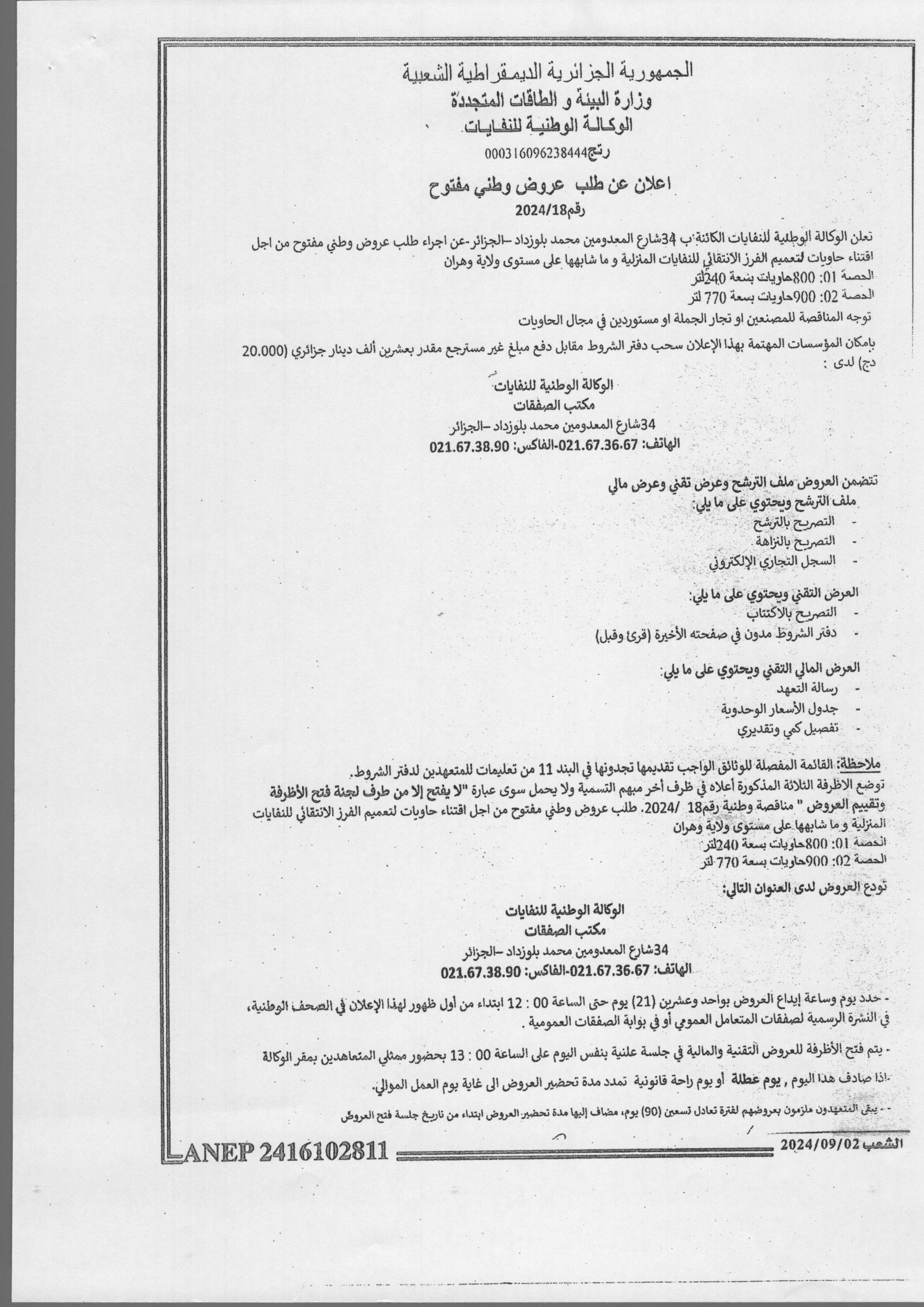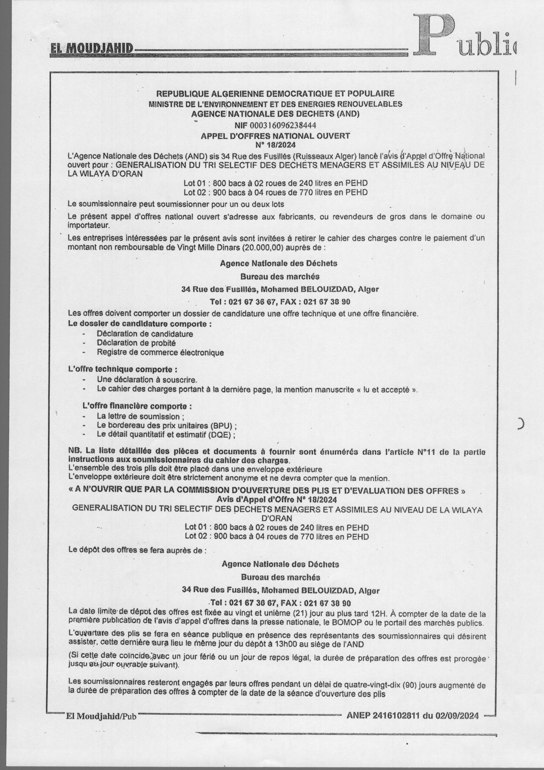 Appel d’offres national ouvert N°18/2024 pour » Généralisation du tri sélectif des déchets ménagers et assimilés au niveau de la wilaya d’Oran »