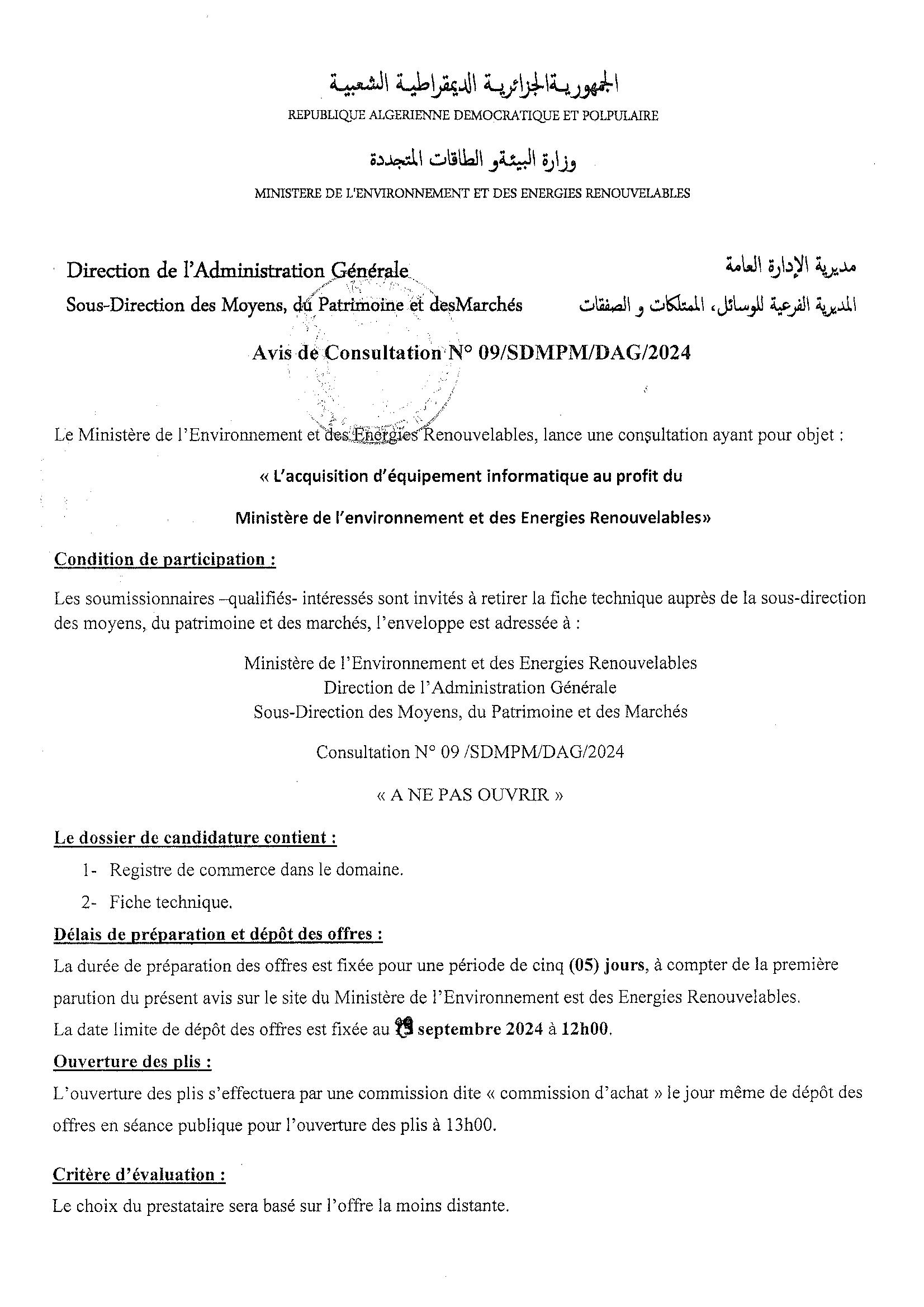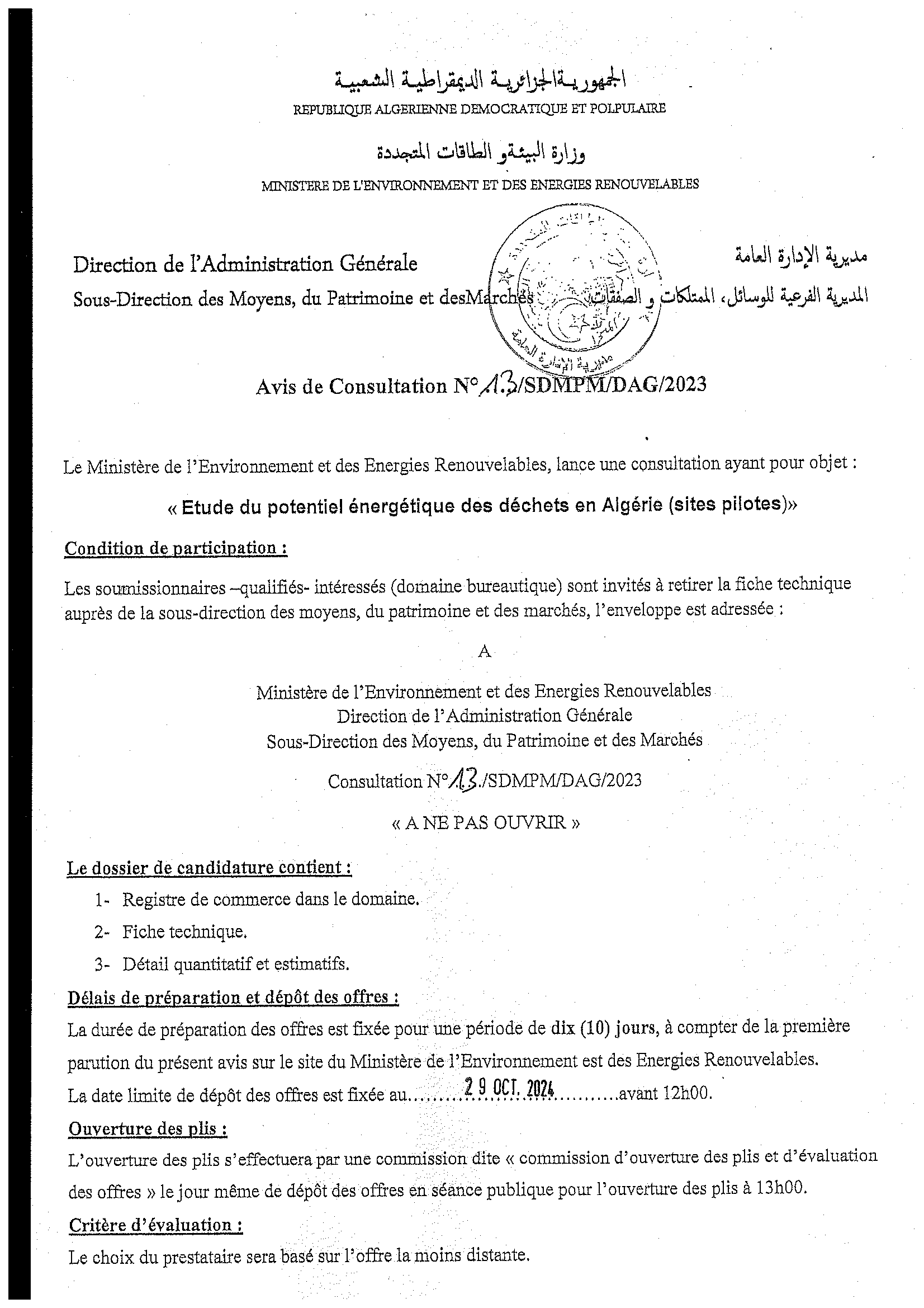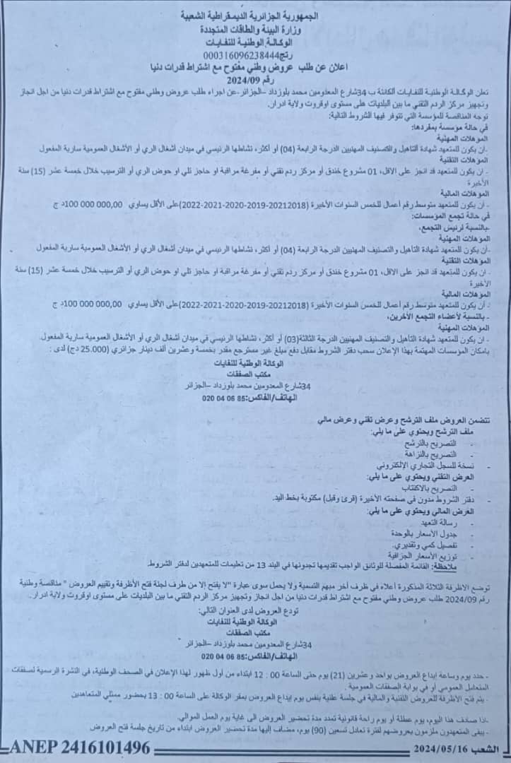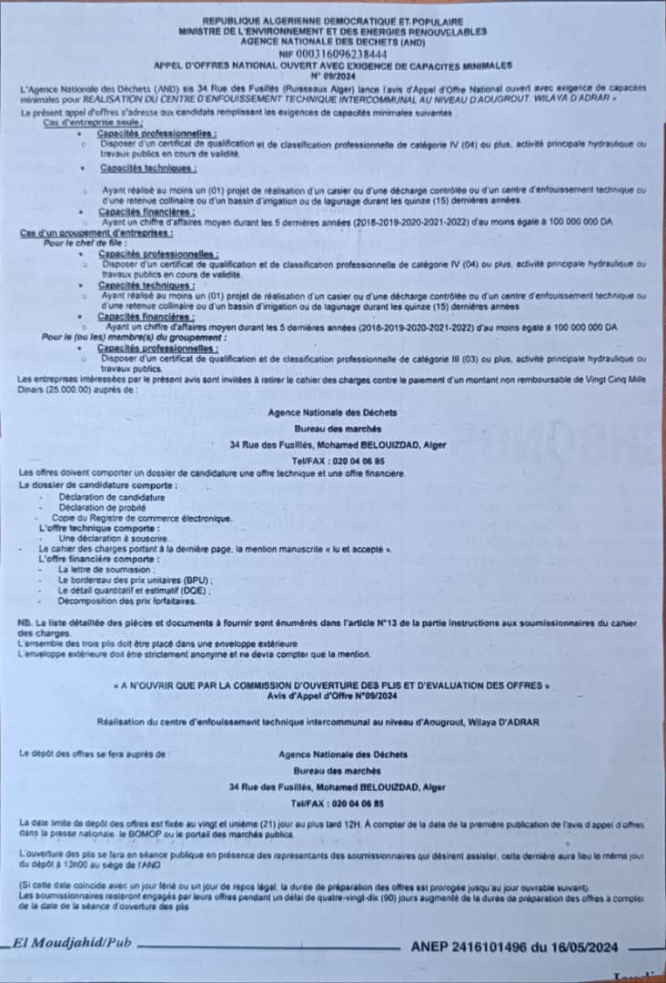 AND N°09/2024 « Réalisation du centre d’enfouissement technique intercommunal au niveau d’Aougrout, wilaya d’Adrar »